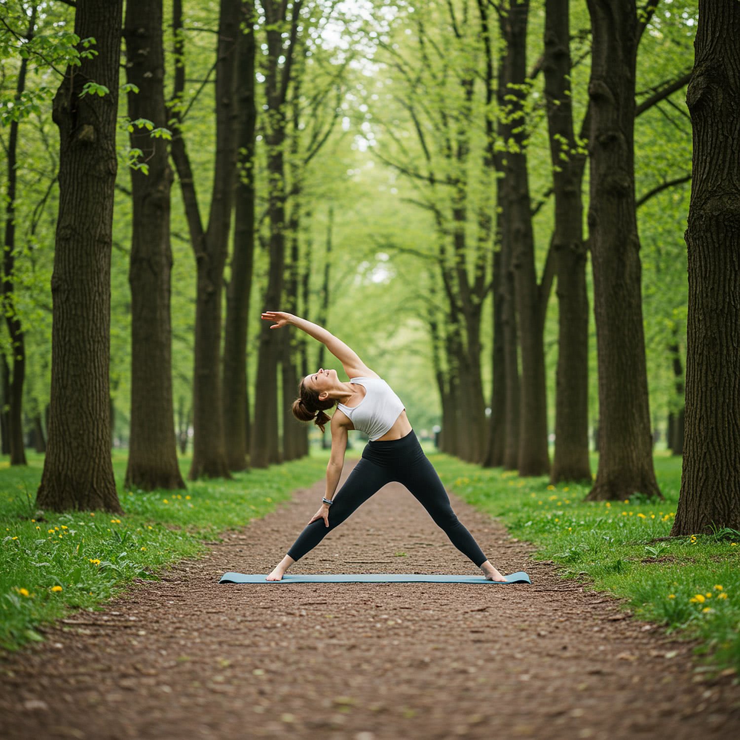 Professional photography of: of a woman in her late 30s performing yoga in a lush park during the morning. She is in a downward dog pose, looking relaxed and energetic with a slight smile, dressed in comfortable yoga attire. The park features tall trees and a clear path, bathed in soft, natural light. The background is slightly blurred to focus on the woman, emphasizing her and the serene environment. The scene is set in spring or summer, with vibrant green foliage, symbolizing health and rejuvenation through physical activity. The composition is balanced and harmonious, highlighting the woman’s connection with nature and her well-being. Overall image style is soft-pastel professional photography with warm colors, brigh soft lightning, soft vignettes, blurred background.