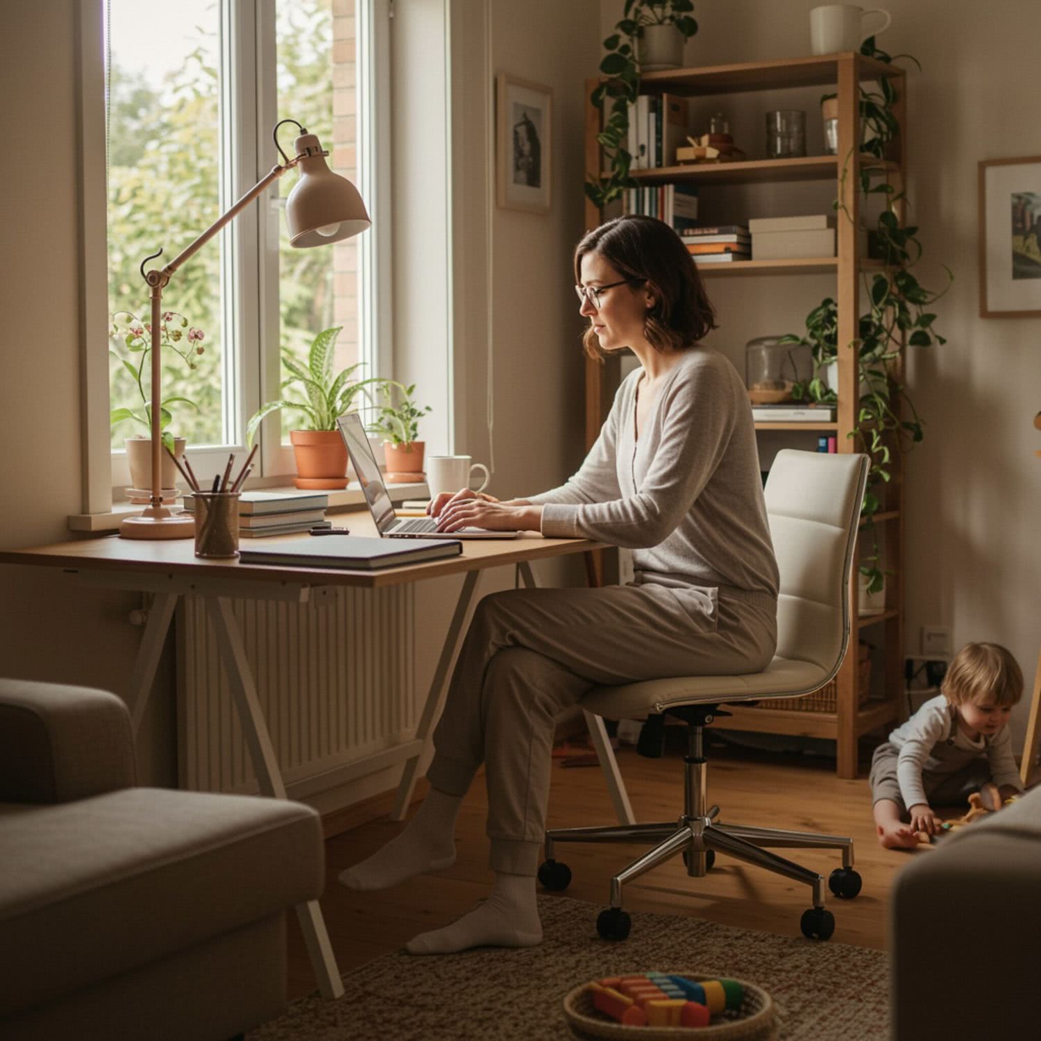Professional photography of: of a woman in her 30s or 40s, dressed in casual, comfortable clothing, sitting at a desk in a cozy home office. She is focused on her laptop, with a small child playing nearby on the floor. The room has natural light coming through a window, which shows a glimpse of a garden outside. The background includes a bookshelf with books and plants, maintaining a warm and inviting atmosphere. The woman’s expression is calm and focused, emphasizing a sense of balance between her work and family life. The overall composition is serene and well-lit, highlighting the harmony of her daily routine without any distracting elements. Overall image style is soft-pastel professional photography with warm colors, brigh soft lightning, soft vignettes, blurred background.