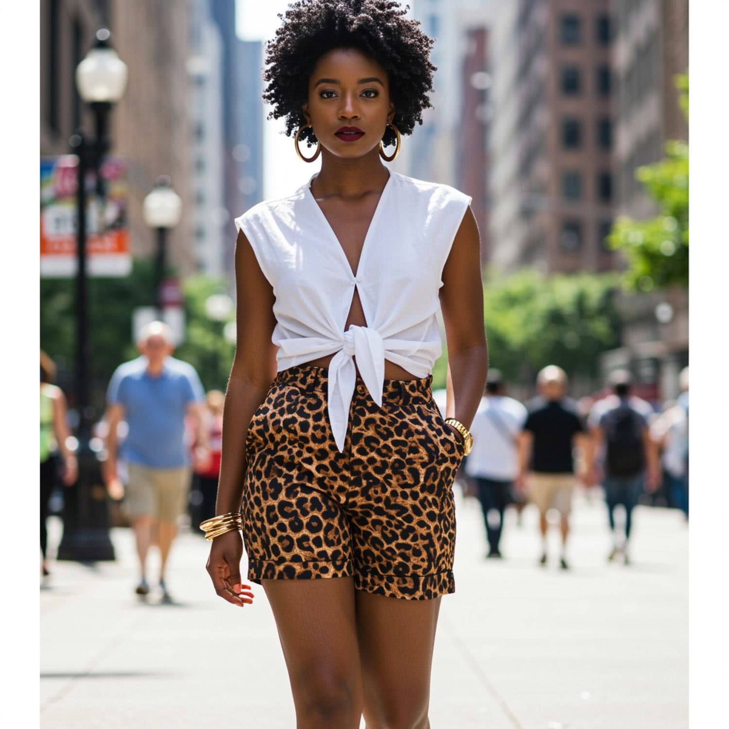 Professional high-resolution fashion photography of: of a woman of African descent with a short afro and dark skin, wearing fitted leopard print shorts with brown spots on a black background, standing confidently on a bustling urban street during a hot summer day. She wears a white blouse tied in a knot and golden bracelets, enhancing her confident and stylish appearance. The background features sunny rays and tall urban buildings, with other pedestrians visible but not prominent, maintaining focus on the woman. The scene is set in a realistic, sunlit environment with natural skin glow, emphasizing the details of her shorts and the summer setting without any distracting elements. Overall image style is professional fashion and style photography with vivid colors, brigh soft lightning, soft vignettes, blurred background.