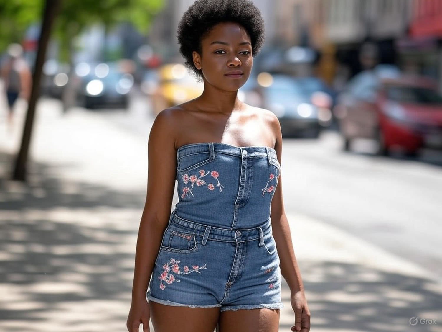Professional high-resolution fashion photography of: of a woman of African descent with dark skin and a short afro, standing on a bustling urban street during a hot summer day. She is wearing denim shorts with delicate floral or ethnic embroidery, highlighting her feminine curves and boho elegance. The background features a cityscape with colorful buildings and a few trees, creating a natural contrast to her skin and attire. The scene is set in the afternoon with bright sunlight, emphasizing the summer atmosphere. The woman’s expression is serene and confident, and she is the central focus of the image, surrounded by a less prominent urban environment that does not distract from her. The overall composition is vibrant yet focused, avoiding any overly busy or explicit elements. Overall image style is professional fashion and style photography with vivid colors, brigh soft lightning, soft vignettes, blurred background.