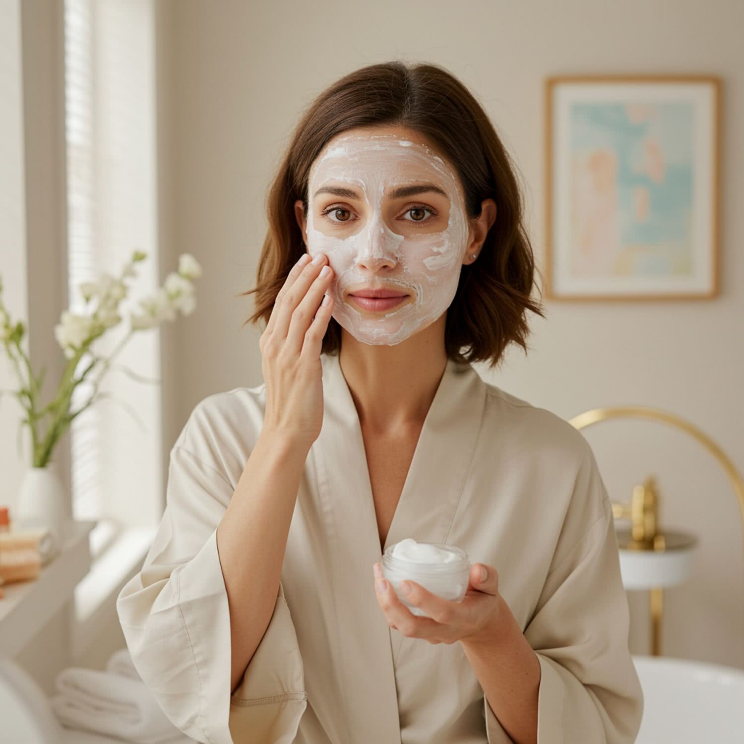 Professional photography of: of a woman in her 30s or 40s with medium-length brown hair, applying a facial mask in a softly lit, elegant bathroom. She is wearing a light-colored robe, and her expression is calm and focused. The background features subtle, abstract patterns in soft pastel colors, suggesting hydration and skin rejuvenation without explicit imagery. Natural light filters through a nearby window, enhancing the serene and relaxing atmosphere. The composition focuses primarily on her face, highlighting the natural glow of her skin and the gentle application of the mask. The overall mood is tranquil and skincare-focused, with no distracting elements in the foreground or background. Overall image style is soft-pastel professional photography with warm colors, brigh soft lightning, soft vignettes, blurred background.