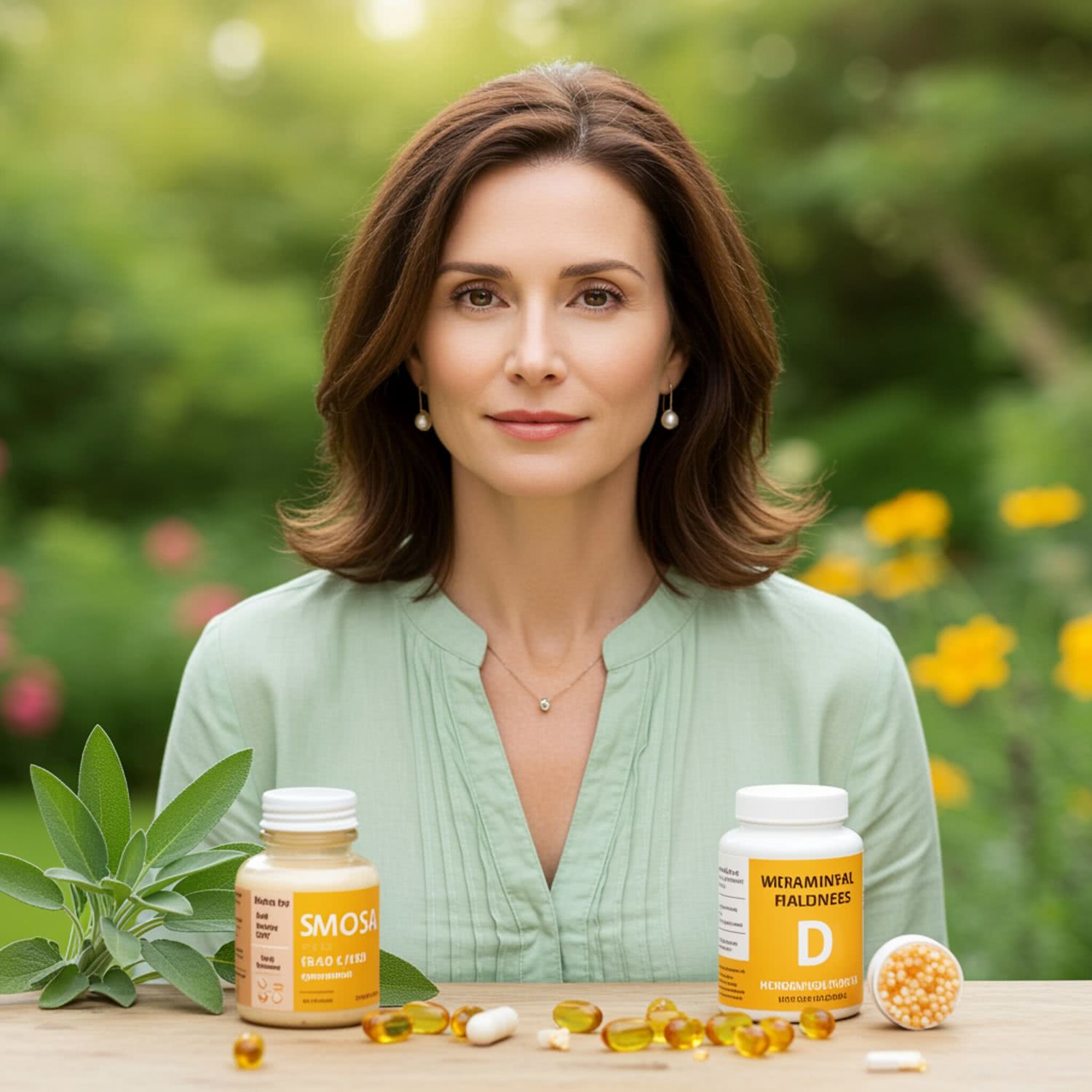 Professional photography of: of a calm woman in her 40s with soft, shoulder-length brown hair, wearing a light green blouse. She is surrounded by natural elements such as sage leaves and vitamin D capsules, symbolizing hormonal balance and relief from menopause symptoms. The setting is a serene, green outdoor environment during the day, with gentle sunlight filtering through the leaves. The background features a lush garden with various flowers and plants, but without any overly distracting elements. The overall composition focuses on the woman, with her face taking up a significant portion of the image, ensuring a therapeutic and realistic portrayal. Overall image style is soft-pastel professional photography with warm colors, brigh soft lightning, soft vignettes, blurred background.