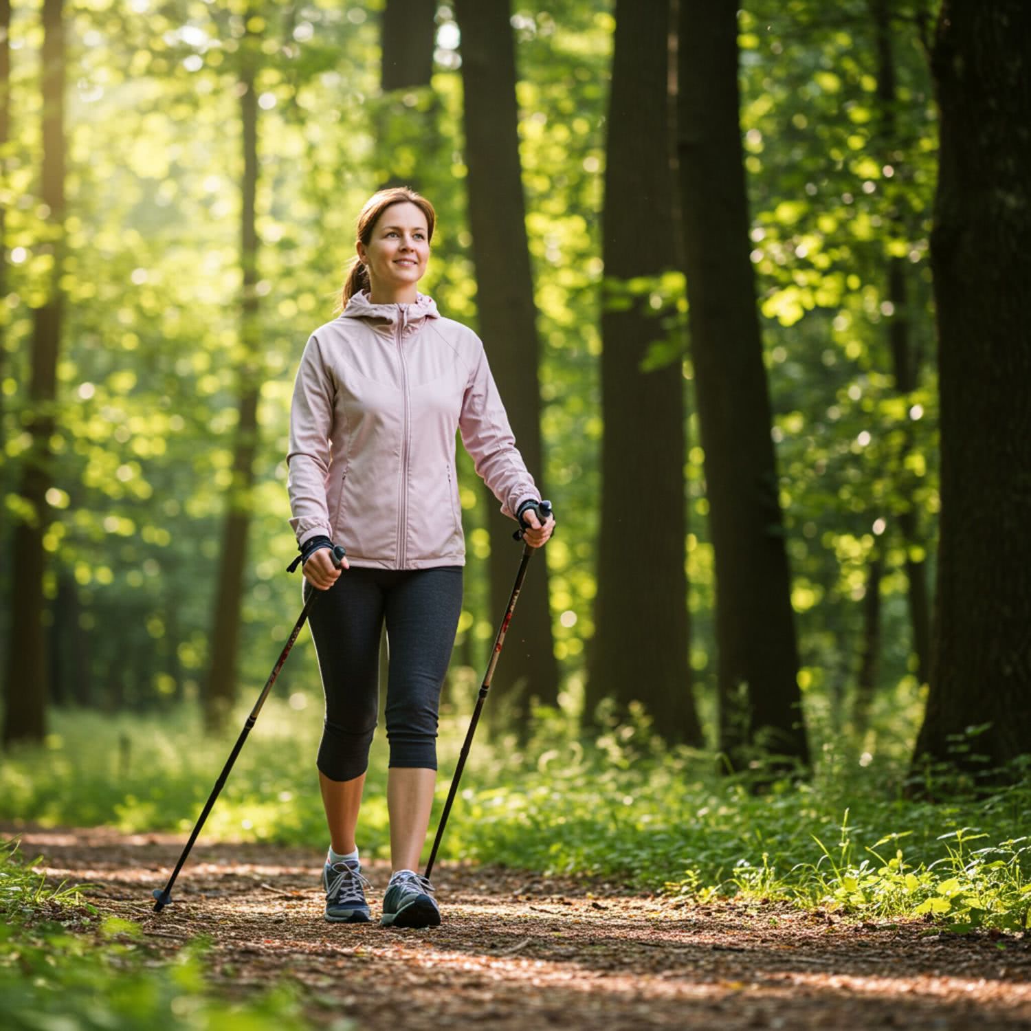 Professional photography of: of a woman in her 30s or 40s actively engaged in Nordic walking in a lush forest during the morning. She is dressed in appropriate outdoor attire, including a lightweight jacket and moisture-wicking pants, with her hair tied back in a ponytail. She holds specialized Nordic walking poles at a 45-degree angle, maintaining an upright posture on a clear forest path. The background features dense trees with sunlight filtering through, creating a serene and natural environment. The scene emphasizes her dynamic movement and the health benefits of the activity, with a focus on her focused yet content expression. The composition is balanced, with the woman slightly to the right, allowing space for the natural elements without distraction. Overall image style is soft-pastel professional photography with warm colors, brigh soft lightning, soft vignettes, blurred background.