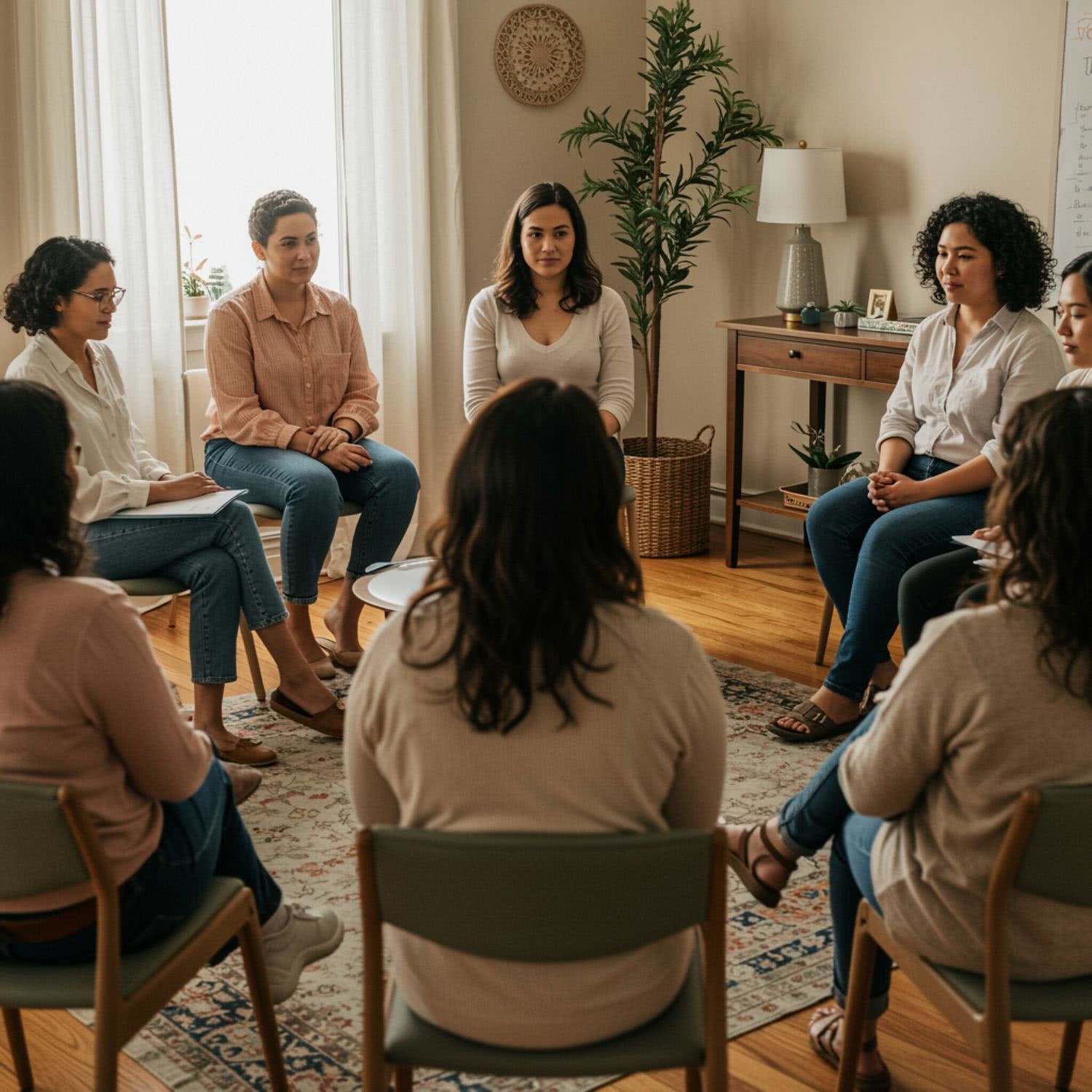 Professional photography of: of a group of diverse women aged 30-40, seated in a circle in a warm, inviting room during a support group meeting. The women, dressed in casual everyday clothes, display expressions of empathy and support. The room features soft, natural lighting and subtle decor like plants and a cozy rug, enhancing the friendly and positive atmosphere. The focus is on the women’s faces and interactions, with no distracting elements or text in the background. The overall composition emphasizes a supportive and motivating environment, suitable for all audiences. Overall image style is soft-pastel professional photography with warm colors, brigh soft lightning, soft vignettes, blurred background.