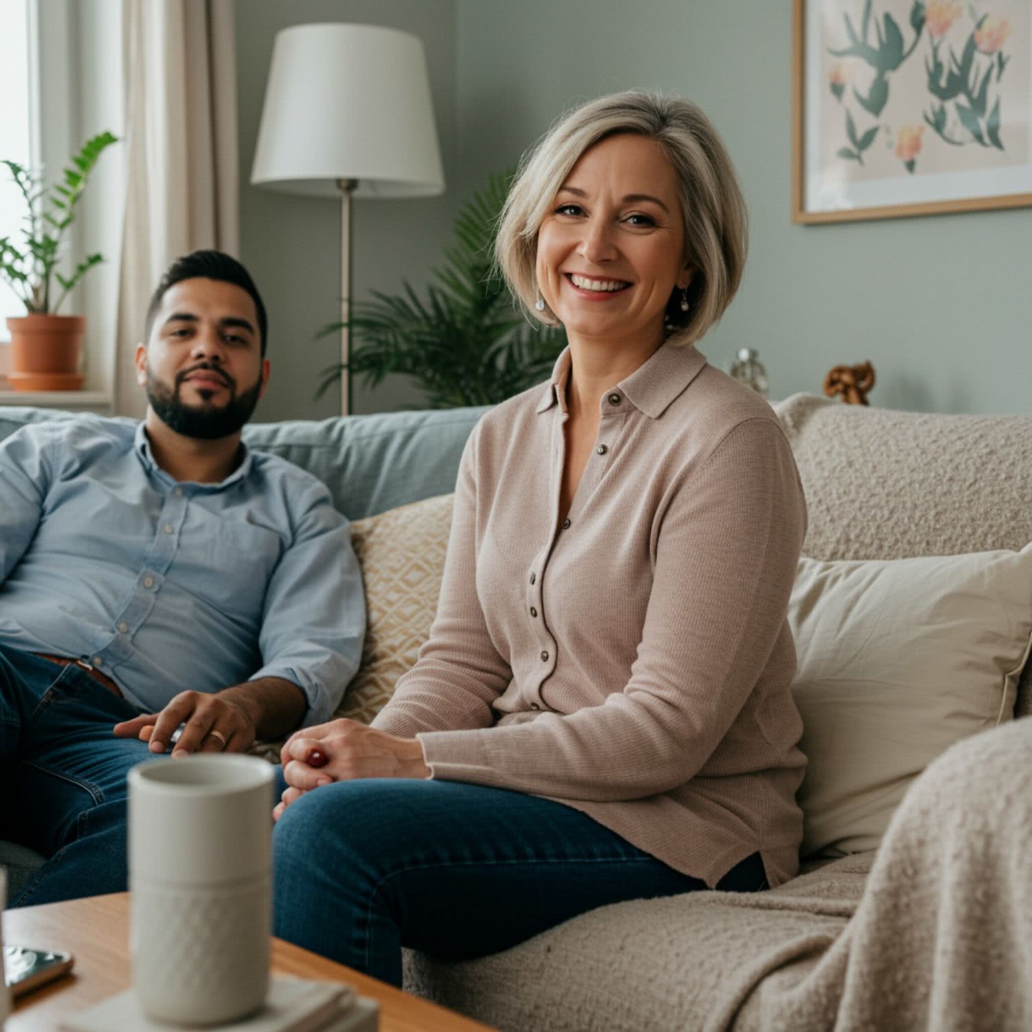 Professional photography of: A professional illustration of a woman in her late 40s, smiling and confident, sitting in a softly lit, pastel-colored living room. She is accompanied by her partner, who is seated beside her, symbolizing emotional closeness. The room features natural light from a window, with a few plants and a cozy blanket on the sofa, creating a relaxing atmosphere. The decor includes muted, soothing colors and subtle textures like soft fabrics and wooden elements. The focus is primarily on the couple, with the background elements supporting the intimate and positive mood without distraction. Overall image style is soft-pastel professional photography with warm colors, brigh soft lightning, soft vignettes, blurred background.