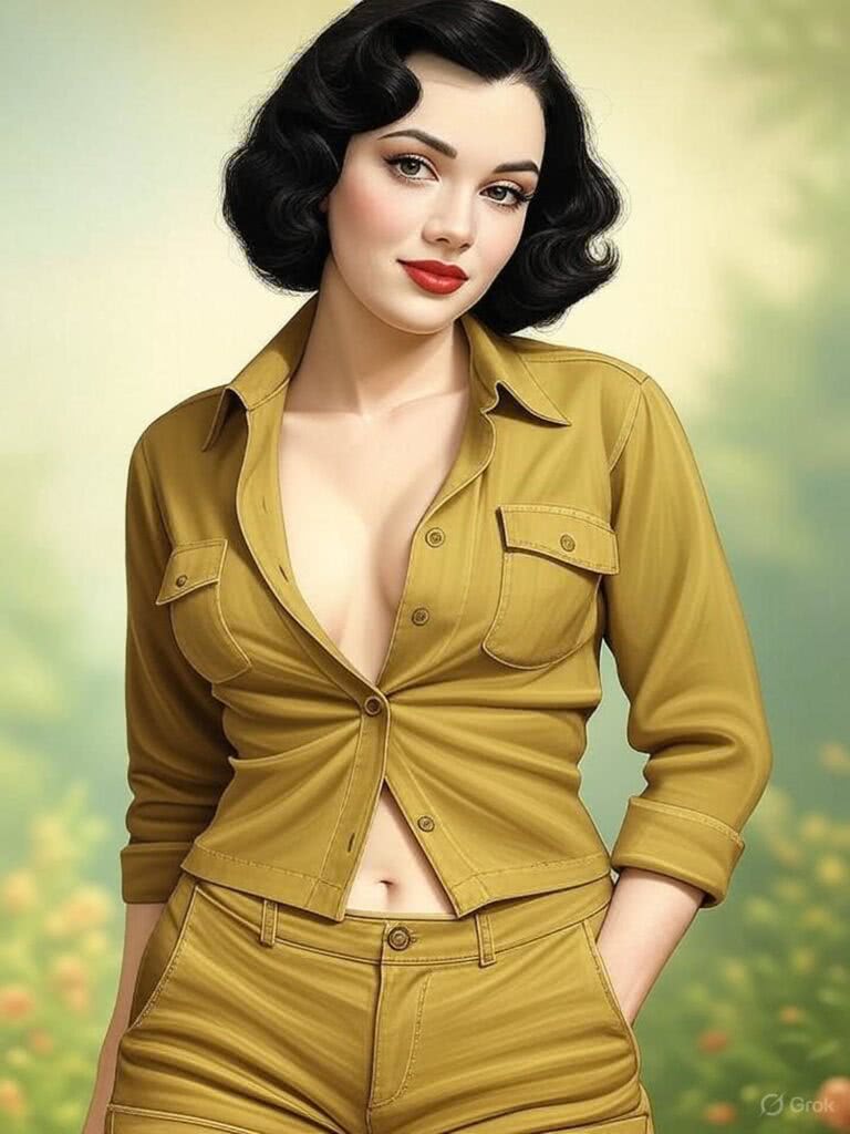 Pociągające sztuczne dziewczyny w strojach khaki pobudzają zmysły, łącząc retro czar pin-up z lat 40. i 50. z intensywnym, niemal namacalnym podtekstem erotycznym, który rozkwita w ich kształtach i ruchach. Ich wizerunki, inspirowane analogowymi zdjęciami o żywych barwach, emanują zmysłowością, a piersi – jako symbol uwodzenia – stają się kluczowym elementem tej uwodzicielskiej narracji. Te cyfrowe kreacje, oparte na zdjęciach, oferują podróż w świat fantazji, gdzie każdy gest budzi pożądanie.