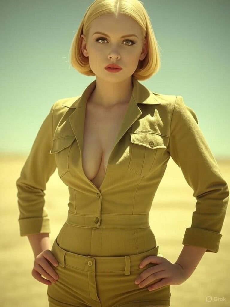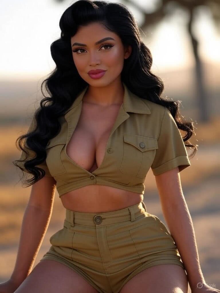 Ich stylizacja skupia się na khaki koszuli, rozpiętej tak, by odsłonić głęboki dekolt, eksponując piersi o pełnych, zmysłowych kształtach – czasem lekko uniesione, kusząco zaokrąglone, czasem miękko opadające z naturalną gracją. Khaki materiał subtelnie przylega do biustu, podkreślając ich krągłości i tworząc iluzję ciepła pod spodem, podczas gdy skóra – opalona jak pustynny piasek lub blada jak poranna mgła – dodaje kontrastu. Krótkie szorty ciasno opinają biodra, wydłużając smukłe nogi, a luźno zawiązane paski dodają dzikiej, nieokiełznanej nuty. Włosy – od rudych, zadziornych fal po czarne, hipnotyzujące kaskady – opadają na ramiona, rzucając cienie na dekolt i potęgując tajemnicę.
