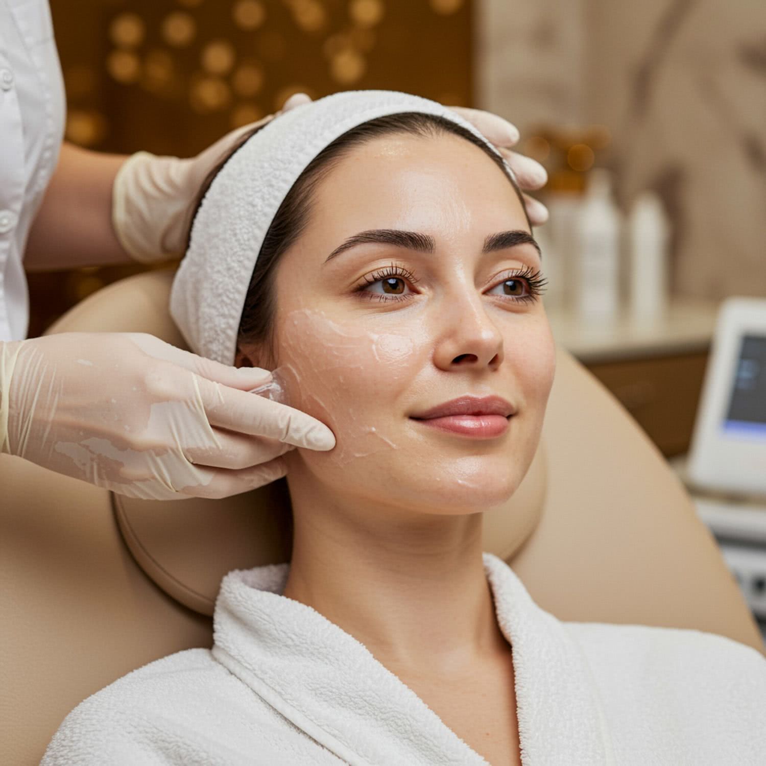 Professional photography of: of a woman in her 30s with delicate facial features, showcasing rejuvenated, radiant skin, in a luxurious spa setting. She is seated in a comfortable chair, receiving a chemical peel or mesotherapy treatment, with subtle effects of skin exfoliation and hydration visible. The scene is lit with warm, natural light, highlighting the skin’s natural glow, firmness, and even tone. The background features soft, blurred elements of an elegant spa room, possibly with marble countertops and subtle gold accents, creating a soothing and inviting atmosphere without any distracting elements like text or screens. The composition focuses closely on her face, emphasizing the skin’s texture and the rejuvenation process, inspiring viewers to consider skincare. Overall image style is soft-pastel professional photography with warm colors, brigh soft lightning, soft vignettes, blurred background.