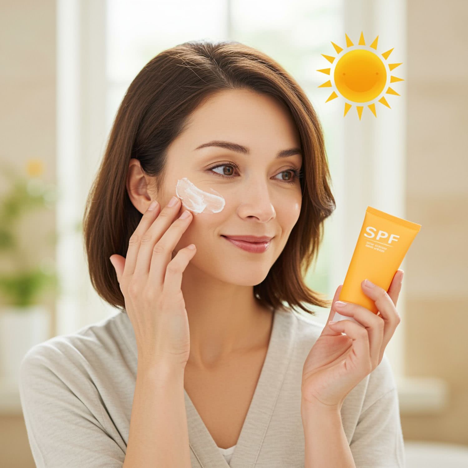 Professional photography of: of a woman in her 30s or 40s, with medium-length brown hair and a gentle smile, applying sunscreen with an SPF filter on her face. She is in a well-lit, cozy bathroom with natural light coming through a window, subtly highlighting UV rays and the sun in the background. She wears a light-colored casual outfit. The scene is set in a warm, natural color palette, creating a calm and inspiring atmosphere. The focus is primarily on her face and the skincare routine, with soft, natural lighting enhancing her healthy skin glow. The background is slightly blurred to emphasize the main subject, ensuring a serene and uncluttered composition. Overall image style is soft-pastel professional photography with warm colors, brigh soft lightning, soft vignettes, blurred background.