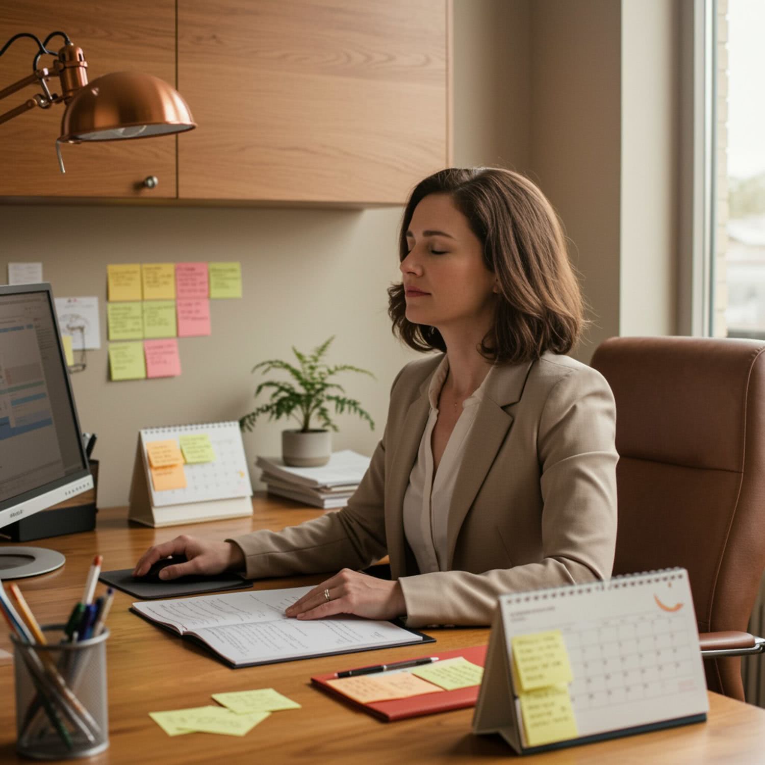 Professional photography of: of a woman in her 30s or 40s with medium-length brown hair, wearing professional attire, seated at a modern office desk. She has her eyes closed and is breathing deeply, indicating a moment of stress relief. The office has a warm, soothing color scheme with natural light entering from a window to her side. On the desk, there is a computer, a notepad with notes, and a calendar, all contributing to a professional yet calm environment. The background is softly blurred, focusing primarily on the woman, with no distracting elements. The overall composition emphasizes her expression and the tranquil atmosphere of the office. Overall image style is soft-pastel professional photography with warm colors, brigh soft lightning, soft vignettes, blurred background.