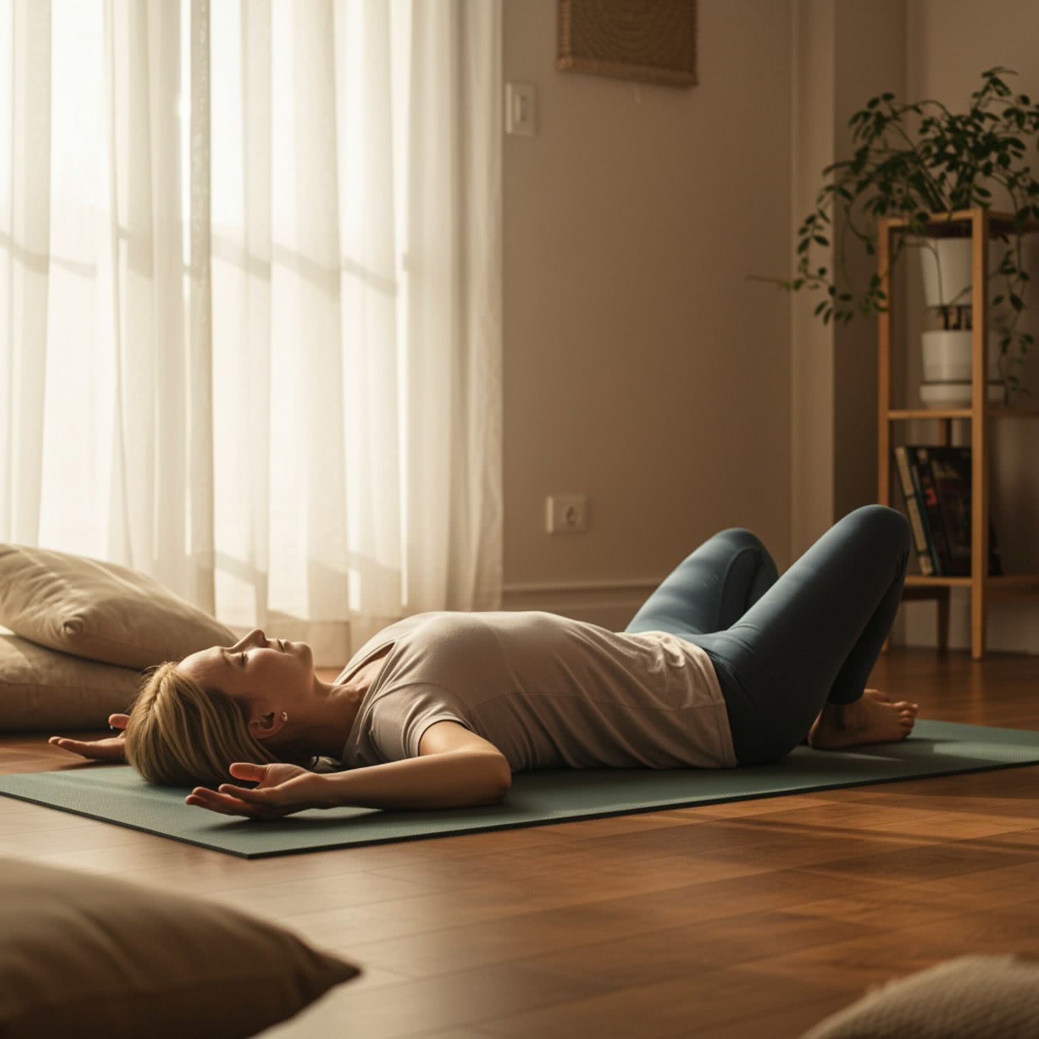 Pierwszą pozycją jest Savasana, czyli pozycja trupa, uważana za fundament relaksu w jodze. Leżysz płasko na plecach, z rękami wzdłuż ciała i dłońmi skierowanymi do góry. Zamknij oczy i skup się na głębokim, powolnym oddechu – wdech przez nos na 4 sekundy, wydech przez usta na 6 sekund. Trzymaj pozycję przez 5-10 minut, pozwalając, by całe ciało opadło na matę. Korzyści? Redukuje lęk i poprawia koncentrację, co jest kluczowe dla kobiet balansujących między pracą a domem. Ciekawostka: W tradycji jogi, Savasana symbolizuje śmierć ego, co oznacza uwolnienie od codziennych zmartwień – jak reset dla umysłu. Porada: Jeśli masz problemy z dolnym odcinkiem kręgosłupa, podłóż poduszkę pod kolana, by uniknąć dyskomfortu.