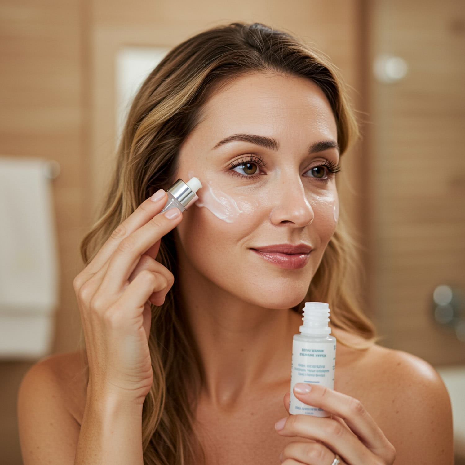 Professional photography of: of a woman in her mid-30s with radiant, moisturized skin, applying hyaluronic acid serum on her face in a serene, well-lit bathroom. She has a gentle, focused expression and her skin shows subtle improvements like filled wrinkles under soft, natural lighting. The background features a slightly blurred bathroom setting with warm, earthy tones, avoiding any distracting elements. Her hair is styled in loose waves, and she wears a simple, casual top. The composition focuses closely on her face and the serum application, with no unnecessary foreground elements, ensuring a balanced and soothing image. Overall image style is soft-pastel professional photography with warm colors, brigh soft lightning, soft vignettes, blurred background.