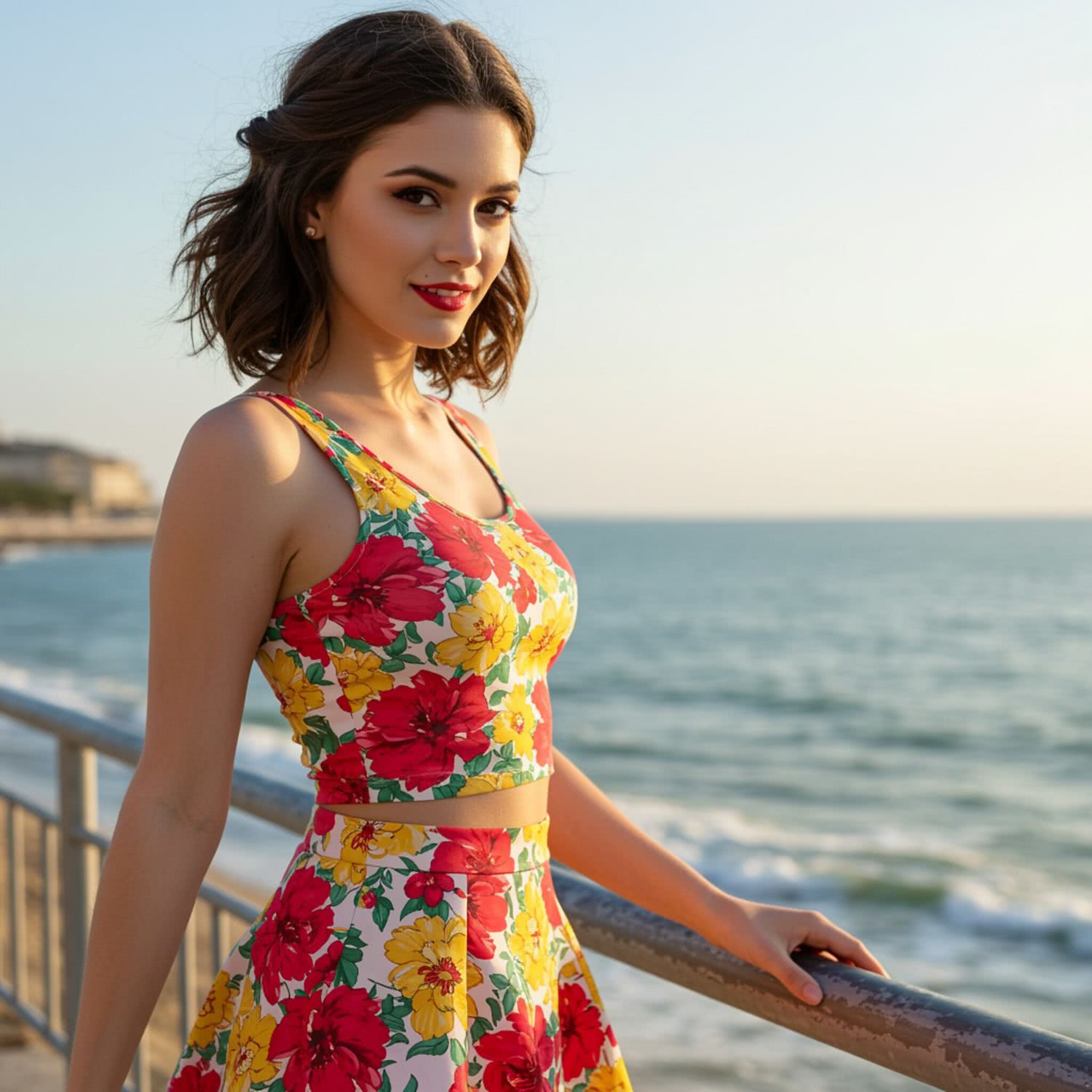 Professional high-resolution fashion photography of: of a young woman with shoulder-length brown hair styled in an elegant updo, wearing a vibrant, floral-patterned tennis skirt in shades of red, yellow, and green, and a matching fitted tank top with deep arm and neckline cutouts. She is positioned on a seaside promenade during a sunny summer day, with the ocean visible in the background. The scene is lit by warm, natural sunlight, emphasizing her vibrant outfit and the summer atmosphere. The background features a clear blue sky and distant waves, ensuring focus remains on the woman without distracting elements. Her expression is natural and slightly smiling, enhancing the cheerful and lively mood of the image. Overall image style is professional fashion and style photography with vivid colors, brigh soft lightning, soft vignettes, blurred background.