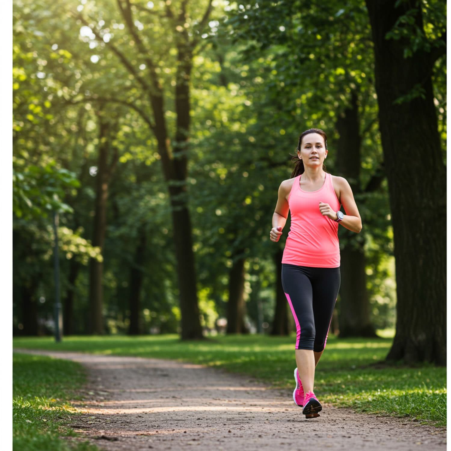 Professional photography of: of a woman in her 30s jogging on a dirt path in a lush park during the early morning. She is dressed in vibrant athletic gear, with her hair tied back, showing determination and energy. The background features dense green foliage and tall trees under soft, natural sunlight, creating a serene and healthy environment. The composition focuses primarily on her, with the park setting providing a rich but non-distracting backdrop. The scene is set to emphasize her cardio exercise and overall fitness, with no unnecessary elements that might detract from the main subject. Overall image style is soft-pastel professional photography with warm colors, brigh soft lightning, soft vignettes, blurred background.
