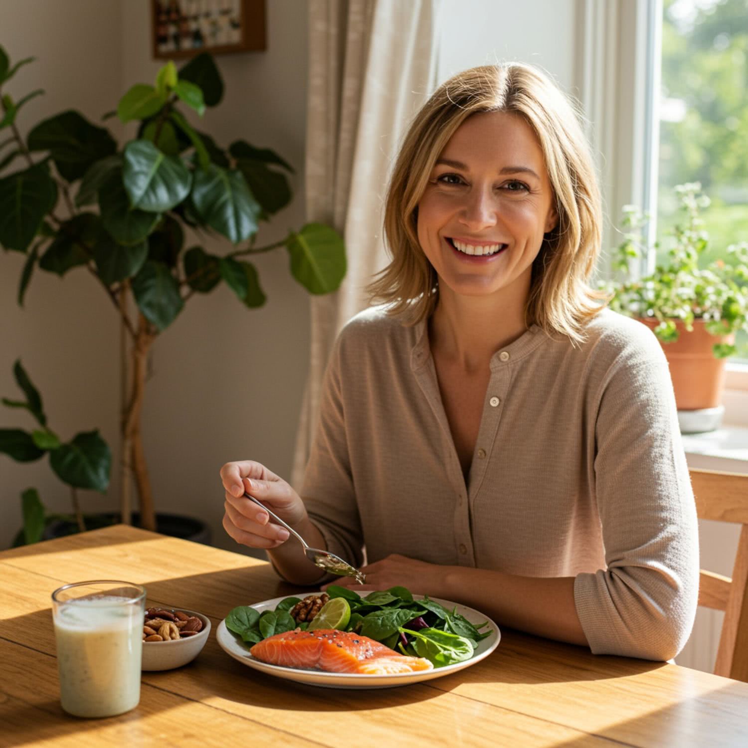 Professional photography of: of a smiling woman in her 30s or 40s, seated at a wooden table with a plate of fresh foods including salmon, spinach, avocado, and nuts. She is dressed in casual, comfortable clothing. The background features a sunlit window with soft, natural light streaming in and lush green plants, creating a warm and inviting atmosphere. The scene is set in a cozy kitchen or dining area, with no distracting elements, focusing on the woman and her meal. The overall composition emphasizes a healthy and positive mood, with the woman’s face and the fresh food as the central elements of the image. Overall image style is soft-pastel professional photography with warm colors, brigh soft lightning, soft vignettes, blurred background.