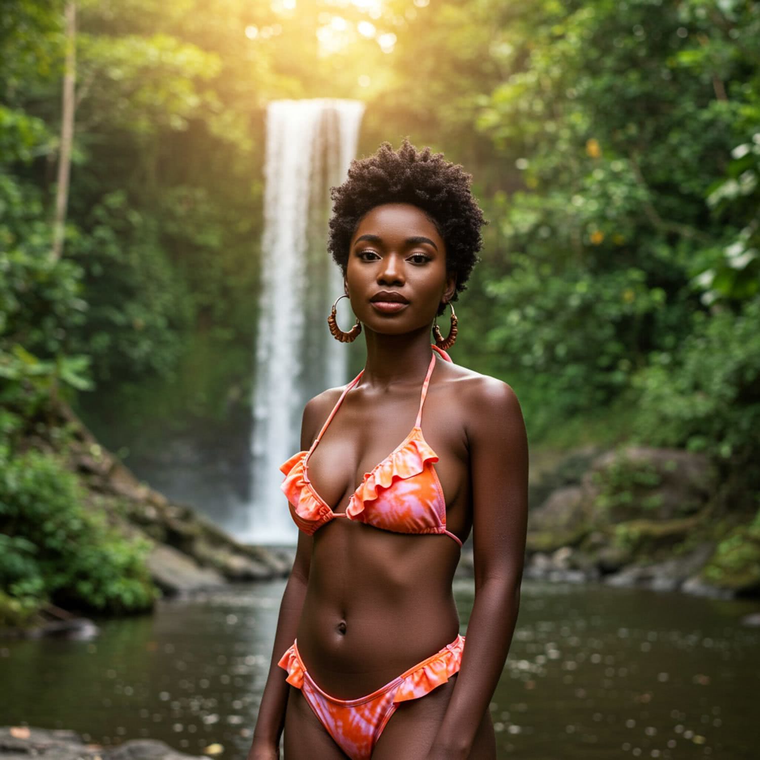 Professional high-resolution fashion photography of: of a woman with African features and dark skin, sporting a short afro, wearing a bikini with tie-dye patterns in shades of orange and pink with ruffles. She is standing by a river in a lush tropical jungle, with a waterfall in the background. The scene is set during the golden hour, providing a warm, romantic glow. The woman’s expression is serene and confident, with her face and upper body in focus. The background features dense, vibrant foliage but is slightly blurred to maintain focus on her. The overall composition emphasizes the harmony between nature and feminine grace, creating an empowering and tranquil atmosphere. Overall image style is professional fashion and style photography with vivid colors, brigh soft lightning, soft vignettes, blurred background.
