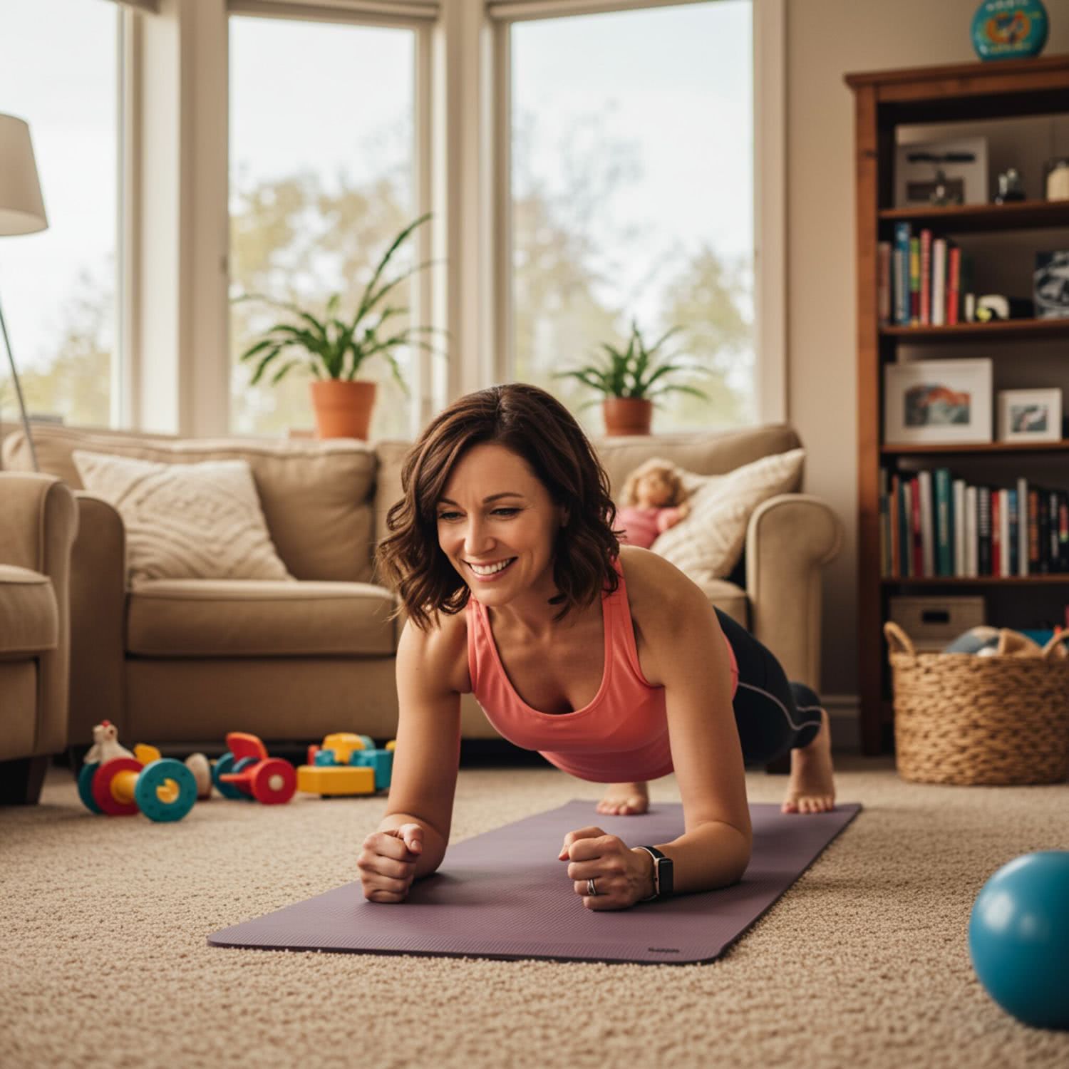 Professional photography of: of a woman in her 30s or 40s, with shoulder-length brown hair and casual workout attire, performing a plank exercise in a cozy, well-lit living room. She has a gentle smile, indicating contentment. The room features natural light from a large window, scattered children’s toys, and a bookshelf in the background. The decor includes warm, earthy tones, creating a welcoming and motivating atmosphere. The focus is primarily on the woman, with the background elements supporting the theme of balancing motherhood and physical activity without being distracting. Overall image style is soft-pastel professional photography with warm colors, brigh soft lightning, soft vignettes, blurred background.