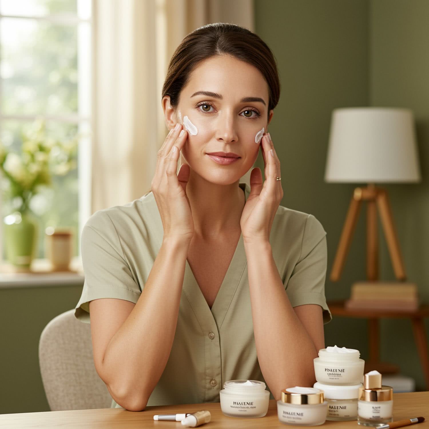 Professional photography of: of a woman in her 30s or 40s with a natural, well-cared-for appearance, applying cream to her face in a softly lit, home environment. She has subtle signs of mature skin, such as fine wrinkles, and her expression is calm and focused. The background features a blurred window with natural light and a vanity table with jars of day and night creams, subtly symbolizing skincare with motifs of hyaluronic acid and SPF. The room is decorated in warm beige and green tones, emphasizing a healthy skin glow and daily skincare routine. The composition is balanced and focused, without any distracting elements, ensuring the woman’s face and the skincare theme are the central focus of the image. Overall image style is soft-pastel professional photography with warm colors, brigh soft lightning, soft vignettes, blurred background.