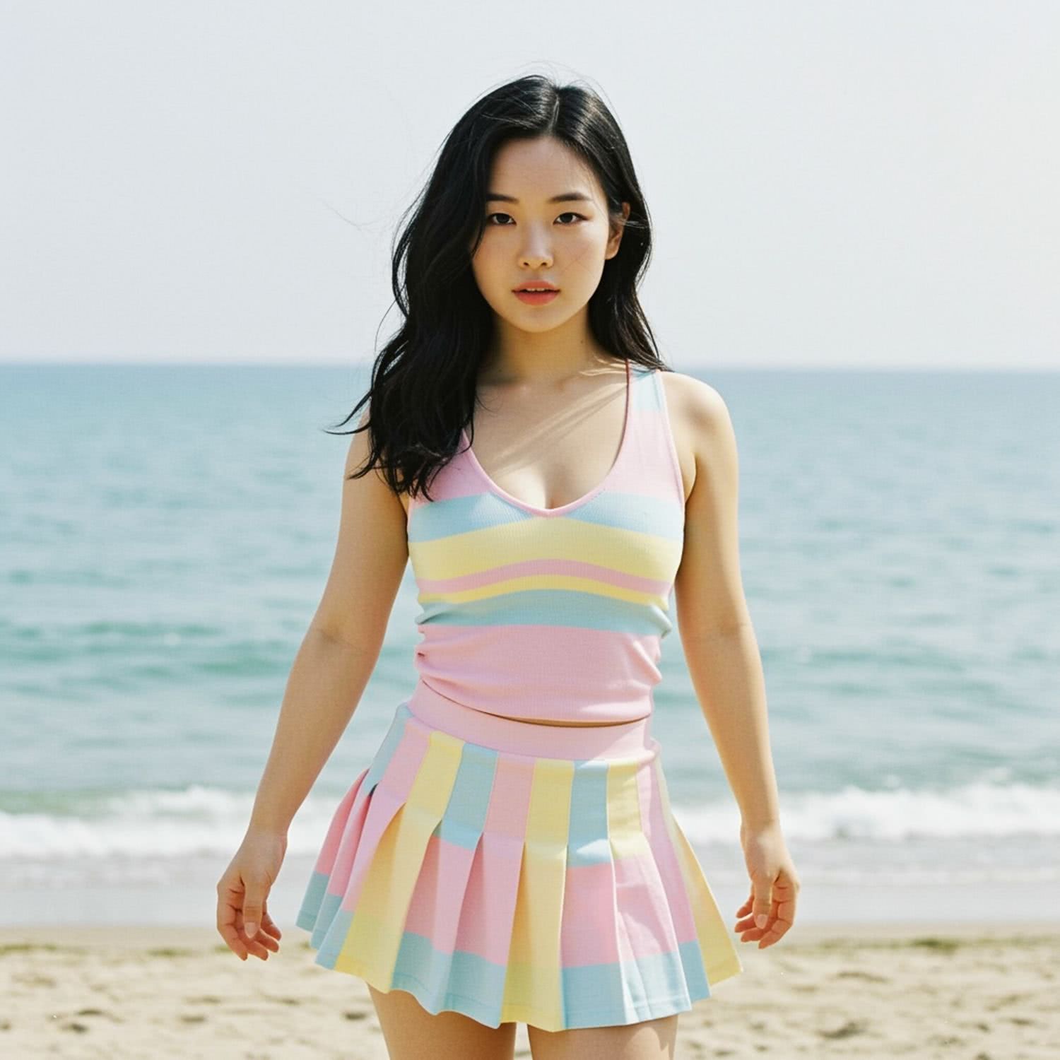 Professional high-resolution fashion photography of: of a petite Asian woman with delicate features, wearing a pastel-striped tennis skirt (pink, blue, and yellow) and a matching tank top with deep necklines. She stands confidently on a sunny beach, with a relaxed yet dynamic pose, her hair slightly blowing in the gentle wind. The background features a calm sea and a clear sky, enhancing the summery and light-hearted mood without distractions. The focus is primarily on her, highlighting her outfit and expression, set against a soft, natural daylight that complements the pastel color scheme of her attire. Overall image style is professional fashion and style photography with vivid colors, brigh soft lightning, soft vignettes, blurred background.