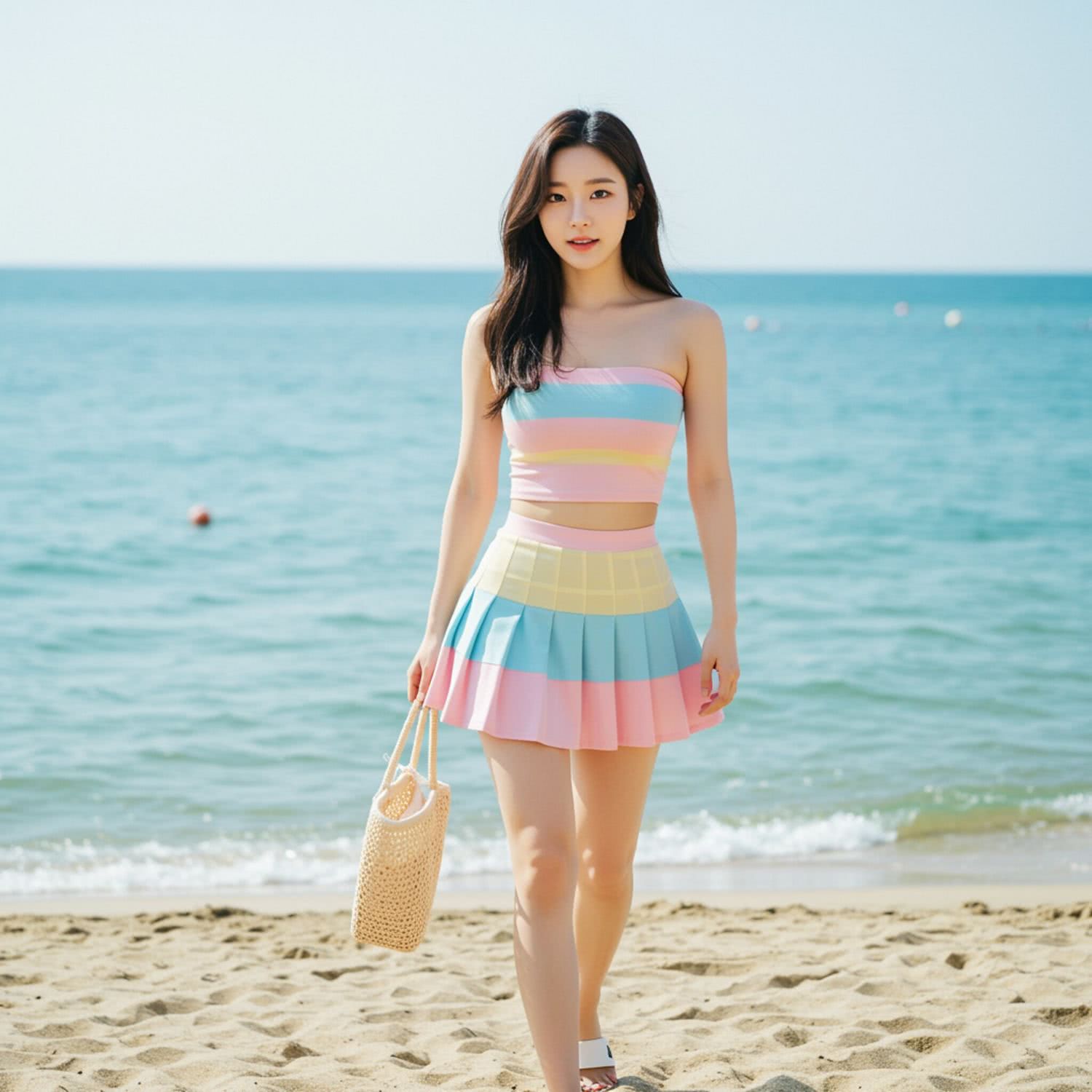 Professional high-resolution fashion photography of: of a slender Korean woman with a slight build, dressed in a pastel-colored tennis skirt with pink, blue, and yellow stripes, paired with a tight, strapless crop top that highlights her waist. She is confidently walking on a sunny beach during a warm summer day, with her skirt slightly fluttering in the wind. The background features a calm ocean and a clear sky, with natural lighting enhancing the vibrant yet harmonious colors of her outfit. The scene is focused primarily on her, emphasizing her attire and the dynamic, vacation-oriented atmosphere without any distracting elements. Overall image style is professional fashion and style photography with vivid colors, brigh soft lightning, soft vignettes, blurred background.