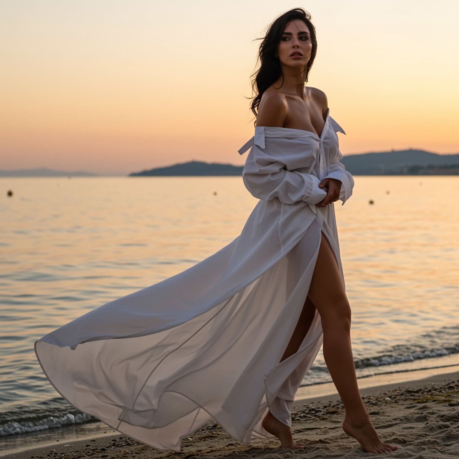 Professional high-resolution fashion photography of: of a woman with Italian features, olive skin, and dark hair, dressed in a long, flowing, semi-transparent skirt with high slits and an oversized blouse falling off one shoulder with undone buttons, revealing her bust. She is on a beach at sunset, with her skirt gently billowing in the light wind. The background features a calm sea and a warm, pastel-colored sky, enhancing the elegant and confident atmosphere. The scene is softly lit by the setting sun, focusing primarily on the woman without distracting elements, ensuring she remains the central figure of the composition. Overall image style is professional fashion and style photography with vivid colors, brigh soft lightning, soft vignettes, blurred background.