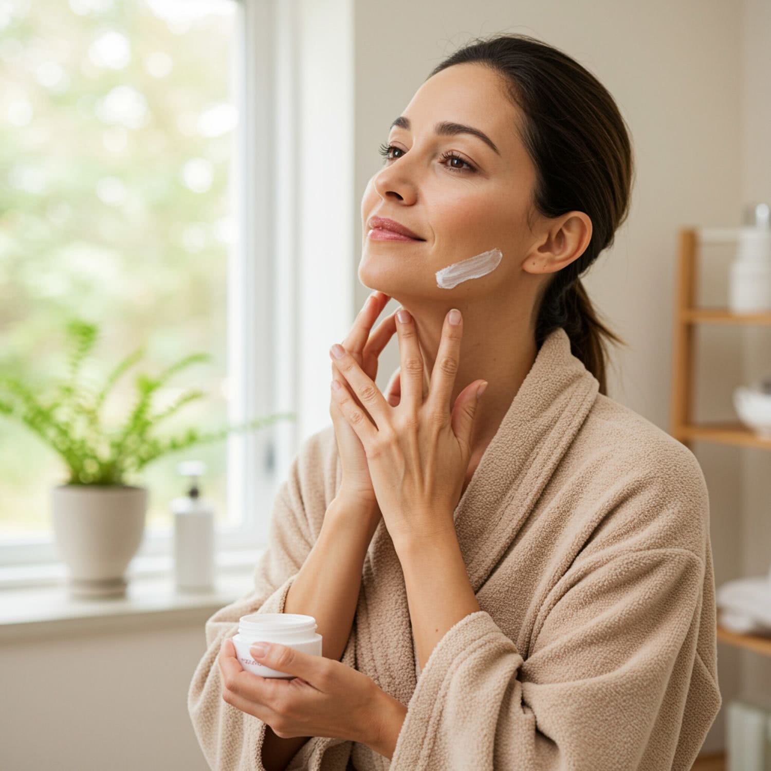 Professional photography of: of a woman in her 30s or 40s with healthy, glowing skin, delicately applying cream to her neck and décolleté in a calm, well-lit home bathroom. She is wearing a soft, comfortable robe and has her hair loosely tied back. The scene features natural lighting from a nearby window, emphasizing the skincare routine with a focus on her face and neck. The background is subtly decorated with a few plants and a blurred view of a garden through the window, maintaining a serene and focused composition without distractions. The overall mood is tranquil and highlights the importance of skincare in a natural, everyday setting. Overall image style is soft-pastel professional photography with warm colors, brigh soft lightning, soft vignettes, blurred background.