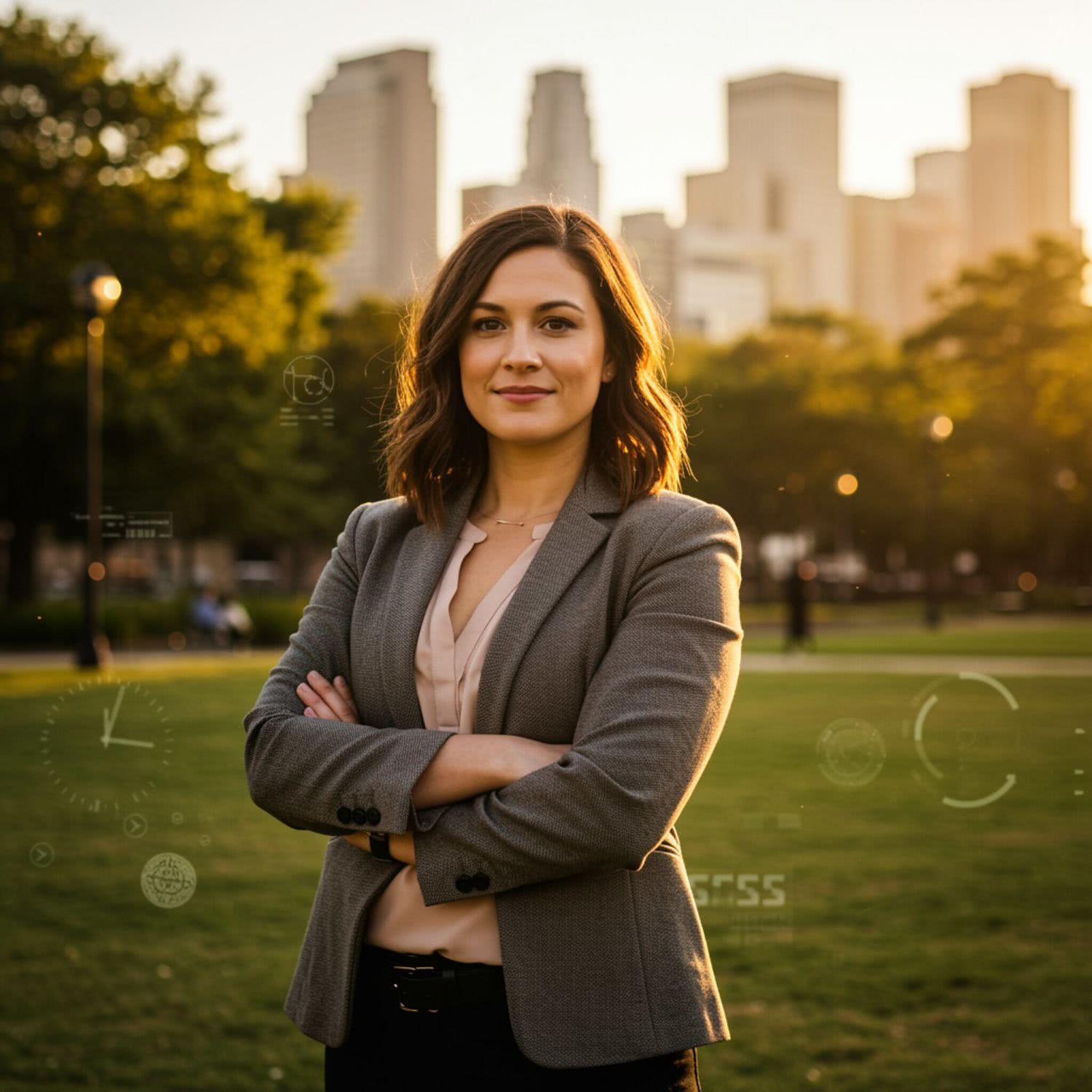 Professional photography of: of a confident woman in her 30s or 40s, standing proudly in a city park during the golden hour. She wears professional attire, possibly a blazer and blouse, and has shoulder-length brown hair. Her expression is serene yet determined, symbolizing strength and personal growth. The background features a cityscape with tall buildings, but they are slightly blurred to keep the focus on her. Subtle elements like faint clock shadows and abstract media forms are present to represent societal pressures she is overcoming. The scene uses a warm color palette to emphasize empowerment and positive change. There are no distracting foreground elements, ensuring the woman remains the central focus of the image. Overall image style is soft-pastel professional photography with warm colors, brigh soft lightning, soft vignettes, blurred background.