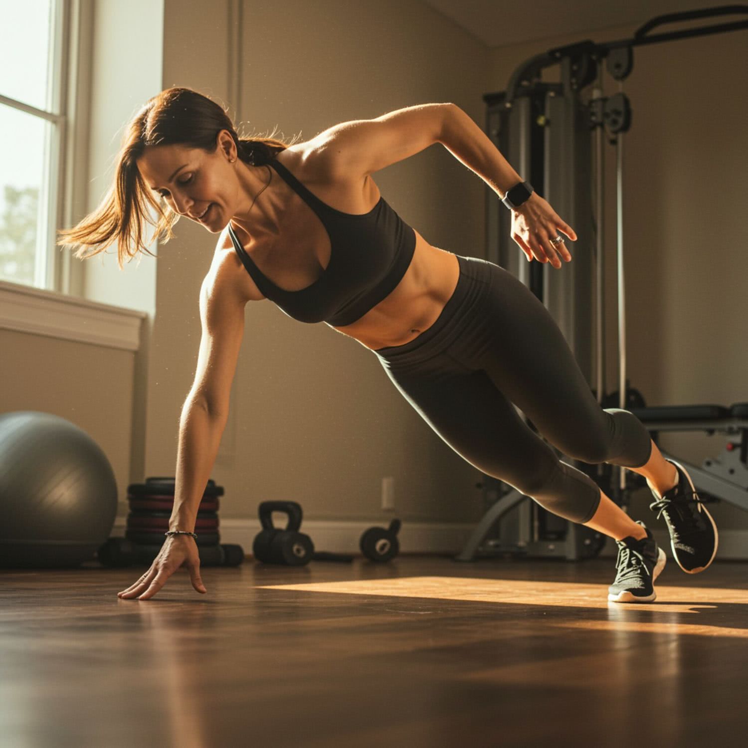 Professional photography of: of an energetic woman in her 30s or 40s performing bodyweight exercises in a home gym. She is dressed in a sports bra and leggings, with her hair tied back, showing determination on her face. The scene is lit by natural light coming from a window to the side, set in a room with neutral-colored walls and minimal gym equipment visible in the background. The composition focuses on her dynamic movement, possibly performing burpees or mountain climbers, with a slight blur in the background to emphasize her activity. The overall mood is motivational and focused, with no distracting elements or text, ensuring the viewer’s attention remains on her workout. Overall image style is soft-pastel professional photography with warm colors, brigh soft lightning, soft vignettes, blurred background.