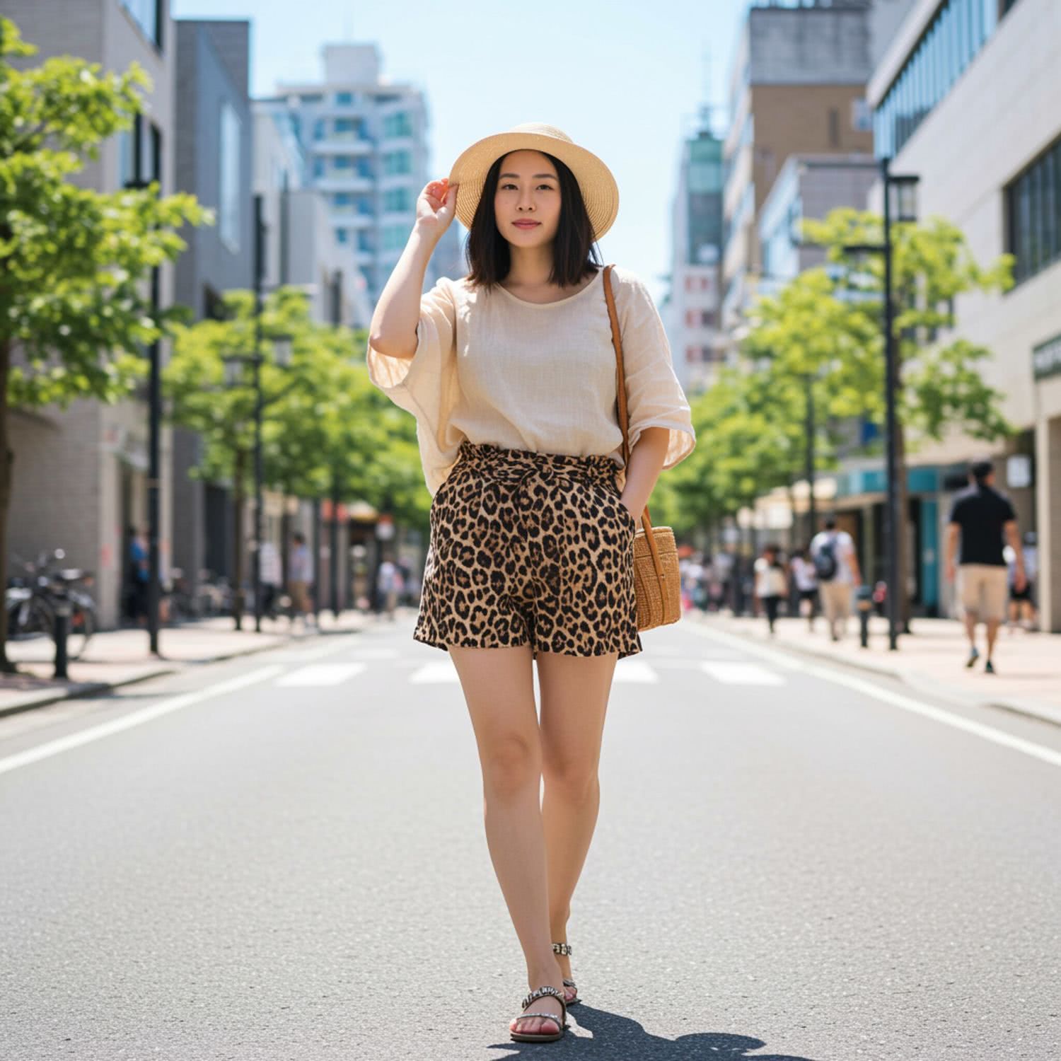 Professional high-resolution fashion photography of: of a confident Asian woman in her mid-20s, dressed in high-waisted leopard print shorts and a loose, airy top, standing on a bustling city street during a hot summer day. She wears flat sandals and a light sun hat, exuding both confidence and style. The background features urban buildings and a clear blue sky with sunlight, creating a realistic and elegant summer scene. The focus is primarily on her, with the background slightly blurred to emphasize her presence. The overall composition highlights her proportions and outfit, particularly the leopard print shorts, while maintaining a clean and focused visual. Overall image style is professional fashion and style photography with vivid colors, brigh soft lightning, soft vignettes, blurred background.