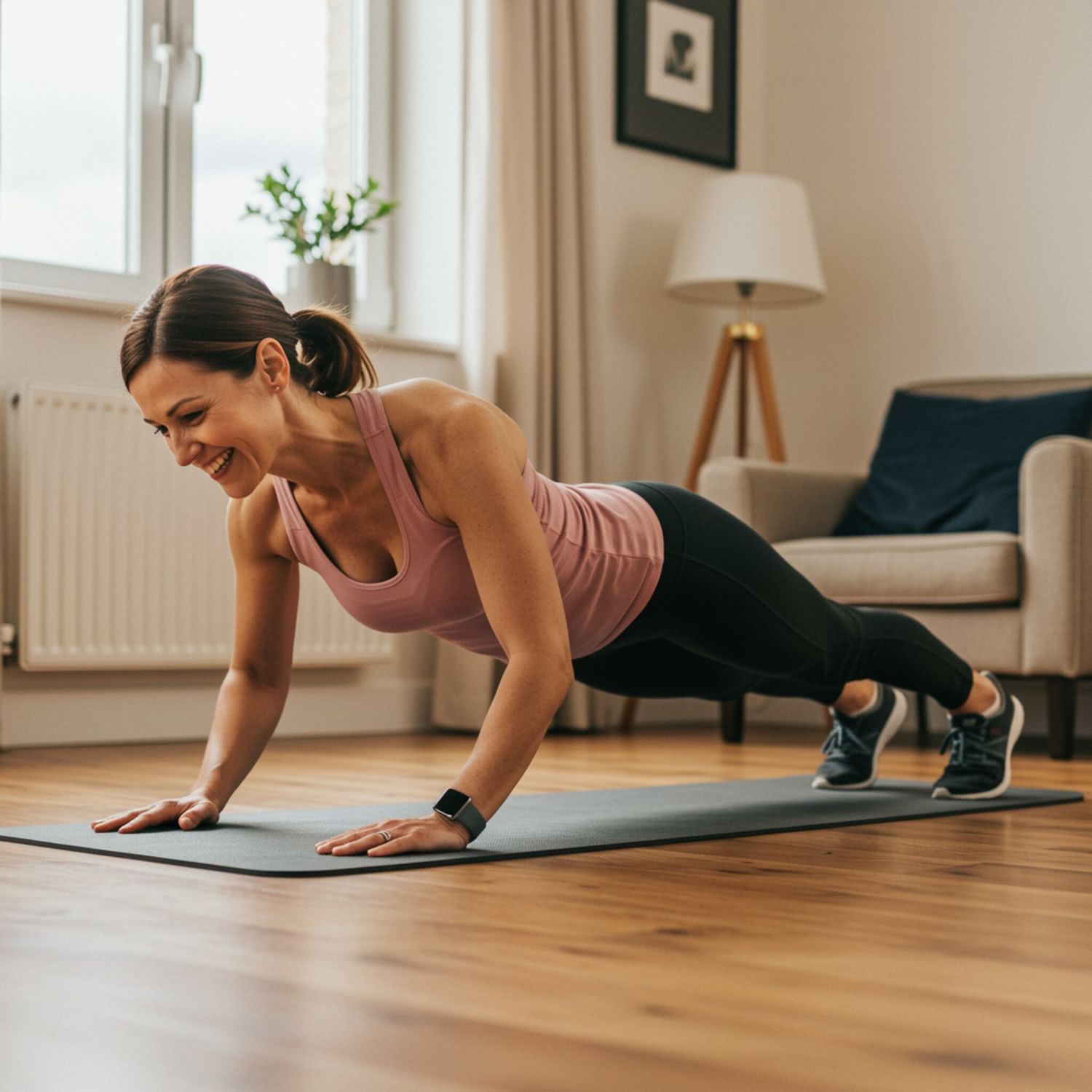 Professional photography of: of a woman in her 30s or 40s performing simple core-strengthening exercises in a well-lit, home gym setting. She is dressed in casual workout attire, with her hair tied back, and has a positive, motivating expression on her face. The focus is on her performing a plank exercise, with a clear emphasis on stability and muscle strength. The background is softly lit with natural light, possibly from a nearby window, and features minimalistic decor to avoid distractions. The room has a warm, inviting atmosphere with natural colors, enhancing the overall positive and energetic vibe of the scene. The composition is dynamic yet focused, ensuring the woman remains the central element of the image. Overall image style is soft-pastel professional photography with warm colors, brigh soft lightning, soft vignettes, blurred background.