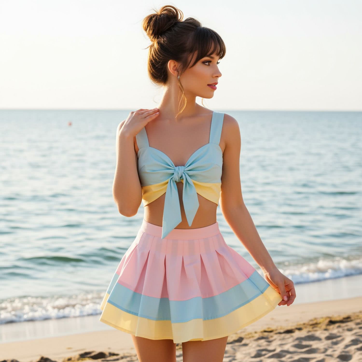 Professional high-resolution fashion photography of: of a young woman with shoulder-length brown hair styled in an elegant bun, wearing a pastel-colored tennis skirt with pink, blue, and yellow stripes, and a matching crop top tied with a bow under her bust. She stands on a sunny beach during the golden hour, with the ocean visible in the background. The scene exudes a sense of elegance and summer vacation, with a soft, warm light enhancing the pastel color palette. The woman’s serene expression and the gentle waves in the background contribute to a harmonious and light-hearted summer atmosphere. Overall image style is professional fashion and style photography with vivid colors, brigh soft lightning, soft vignettes, blurred background.