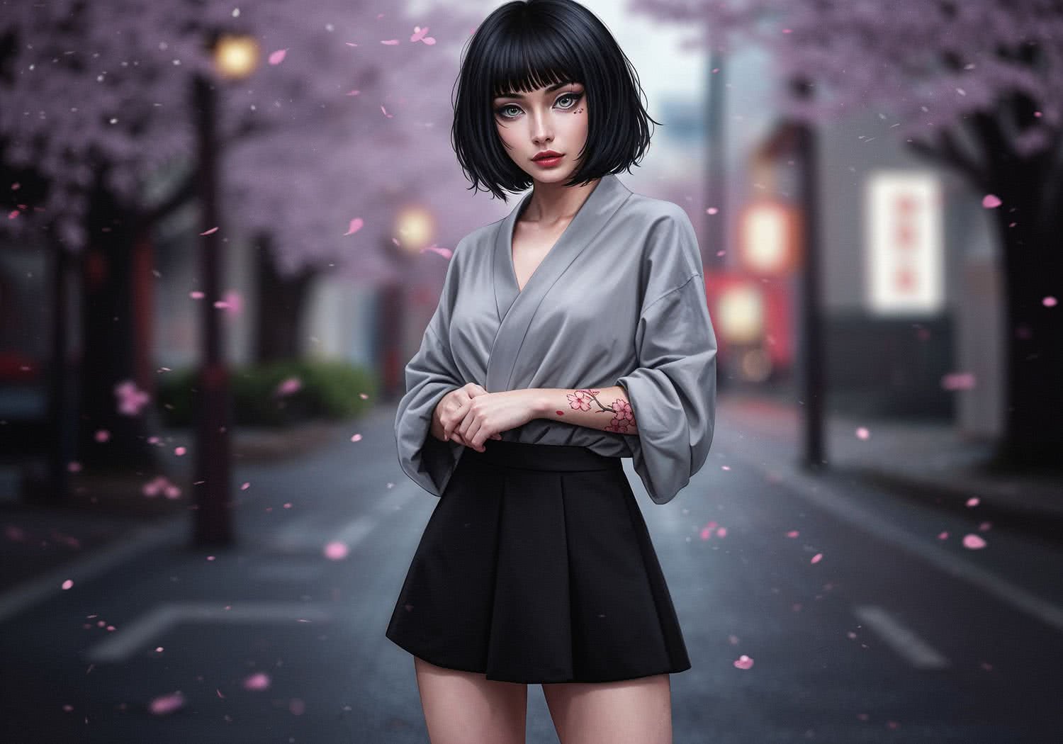 Professional high-resolution fashion photography of: A professional illustration of a young Japanese woman with porcelain skin, short black hair with straight bangs framing her face, and dark expressive eyes enhanced by subtle cat-eye liner and nude makeup for a natural glow. She wears an oversized gray kimono-style blouse in dove gray silk with wide sleeves loosely draped over her shoulders, revealing a delicate sakura cherry blossom tattoo on her wrist, paired with a sleek black A-line mini skirt that accentuates her slender legs. She stands confidently in a soft spring evening light, with subtle urban cherry blossoms in the background, evoking elegant sensuality and Japanese minimalism. High detail, realistic style, warm tones, full-body view. Overall image style is professional fashion and style photography with vivid colors, brigh soft lightning, soft vignettes, blurred background.