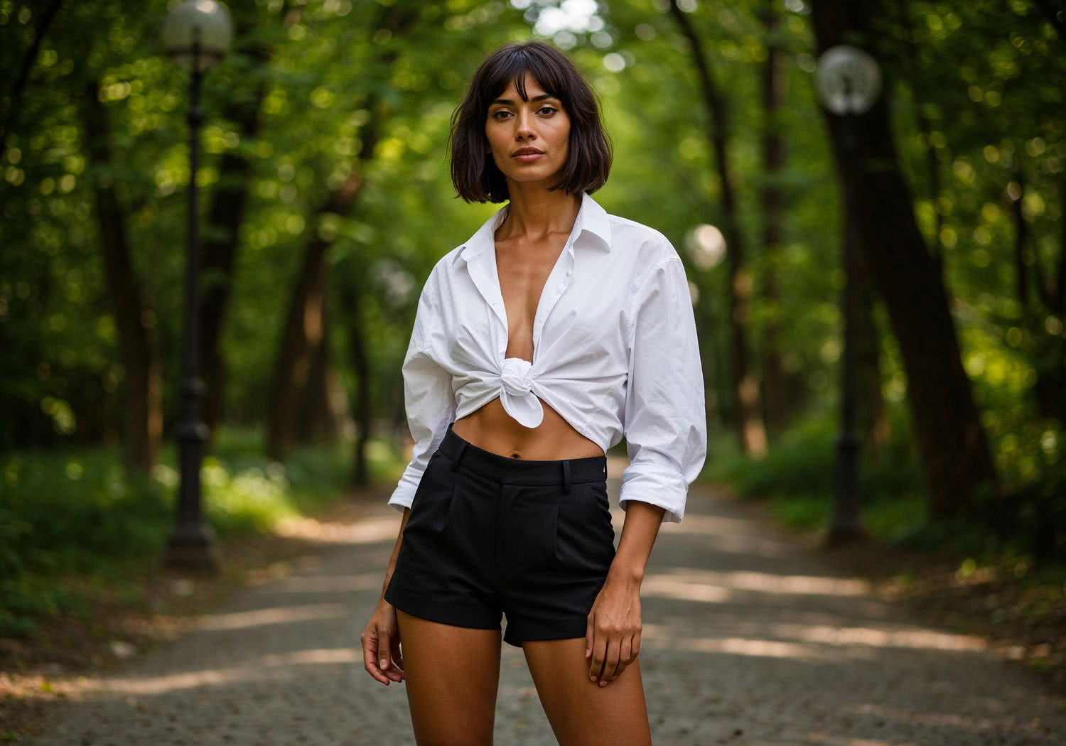Inspiracja: Wyobraź sobie tę stylizację na berlińskiej ulicy – brunetka w rozpiętej koszuli, szortach eksponujących opaloną skórę i loafersach stukających o bruk. To look prosto z Pinterestu, ale z niemieckim twistem: chłodna pewność siebie, bez zbędnych ozdób.