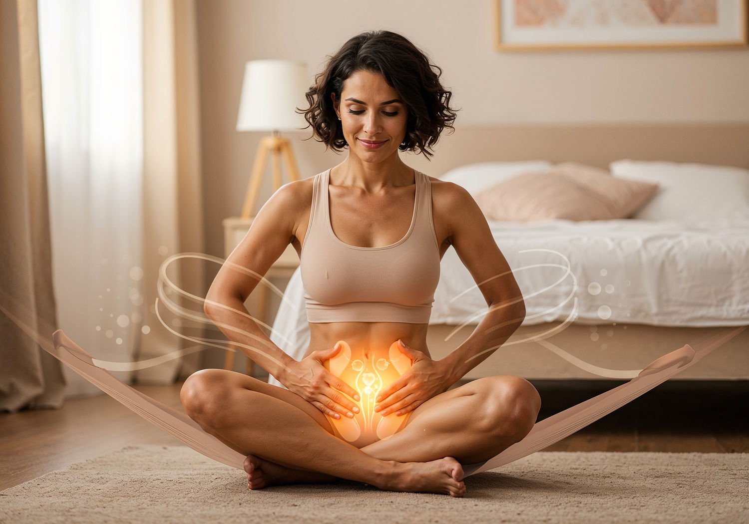 Professional photography of: A professional digital illustration depicting an empowered woman in her mid-30s, with a serene and confident expression, sitting cross-legged in a softly lit, minimalist bedroom setting. She is subtly performing pelvic floor exercises, her hands resting gently on her lower abdomen, with a warm, ethereal glow emanating from her pelvic region to symbolize inner strength, enhanced blood flow, and heightened intimacy. Surrounding her are faint, abstract elements like flowing waves of energy representing pleasure and waves of confidence, integrated into a elegant, anatomical silhouette of the pelvic floor muscles as a supportive hammock structure beneath her form. The overall style is realistic yet symbolic, in warm earth tones with soft lighting to evoke empowerment and sensuality without explicitness. Overall image style is soft-pastel professional photography with warm colors, brigh soft lightning, soft vignettes, blurred background.