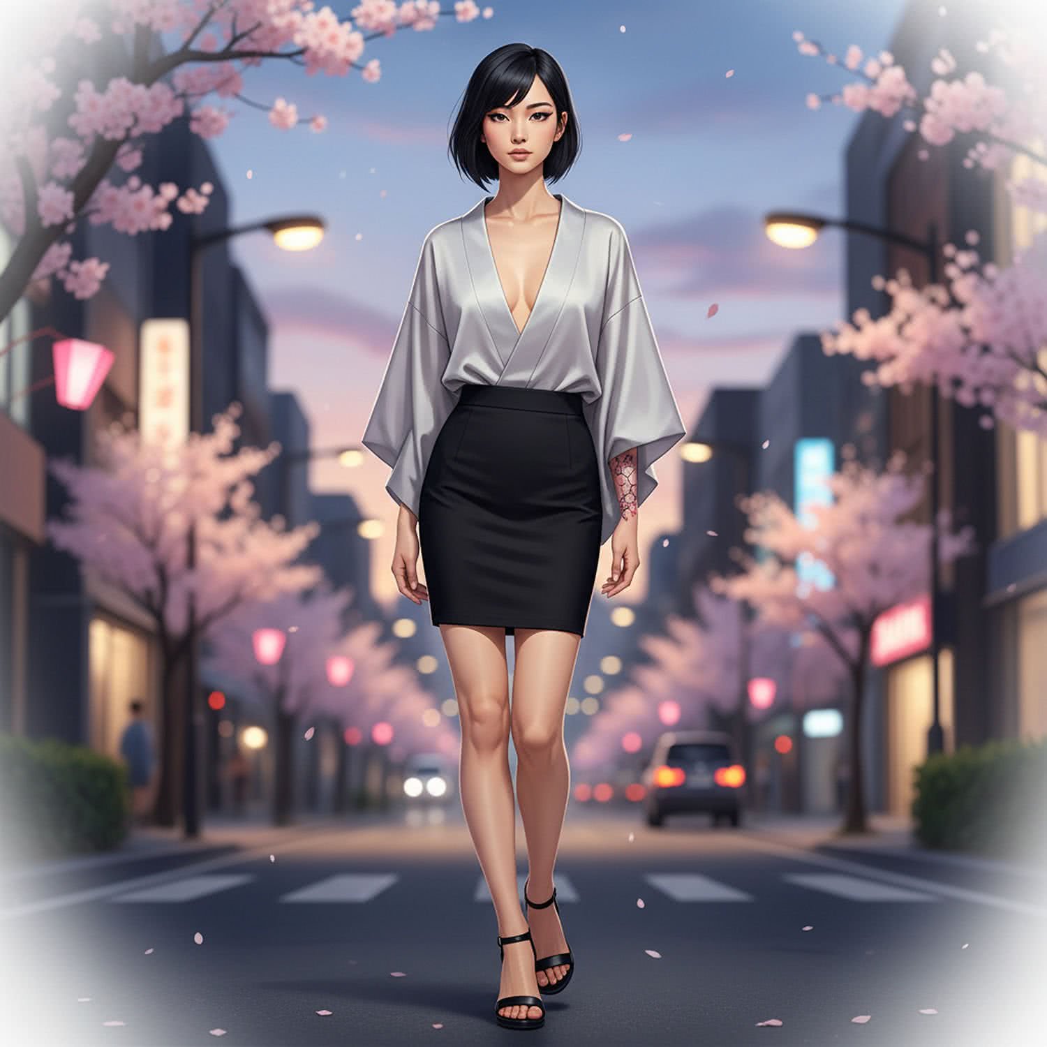 Professional high-resolution fashion photography of: A professional illustration of a young Japanese woman with porcelain skin and a delicate, slender figure, strolling elegantly on an evening city street during spring. She has short black hair with soft bangs swept to the side, subtle nude makeup with a dewy glow on her cheeks and a precise black eyeliner accentuating her almond-shaped eyes. She wears a loose, oversized gray kimono-style blouse made of light silk with wide sleeves and a deep V-neckline revealing her collarbones, paired with a fitted black mini pencil skirt reaching mid-thigh, and black low-heeled cut-out sandals. Her right wrist features a delicate cherry blossom sakura tattoo. The background shows softly lit urban lanterns, blooming cherry trees, and a twilight sky, evoking a harmonious blend of traditional Japanese elegance and modern sensuality. Overall image style is professional fashion and style photography with vivid colors, brigh soft lightning, soft vignettes, blurred background.