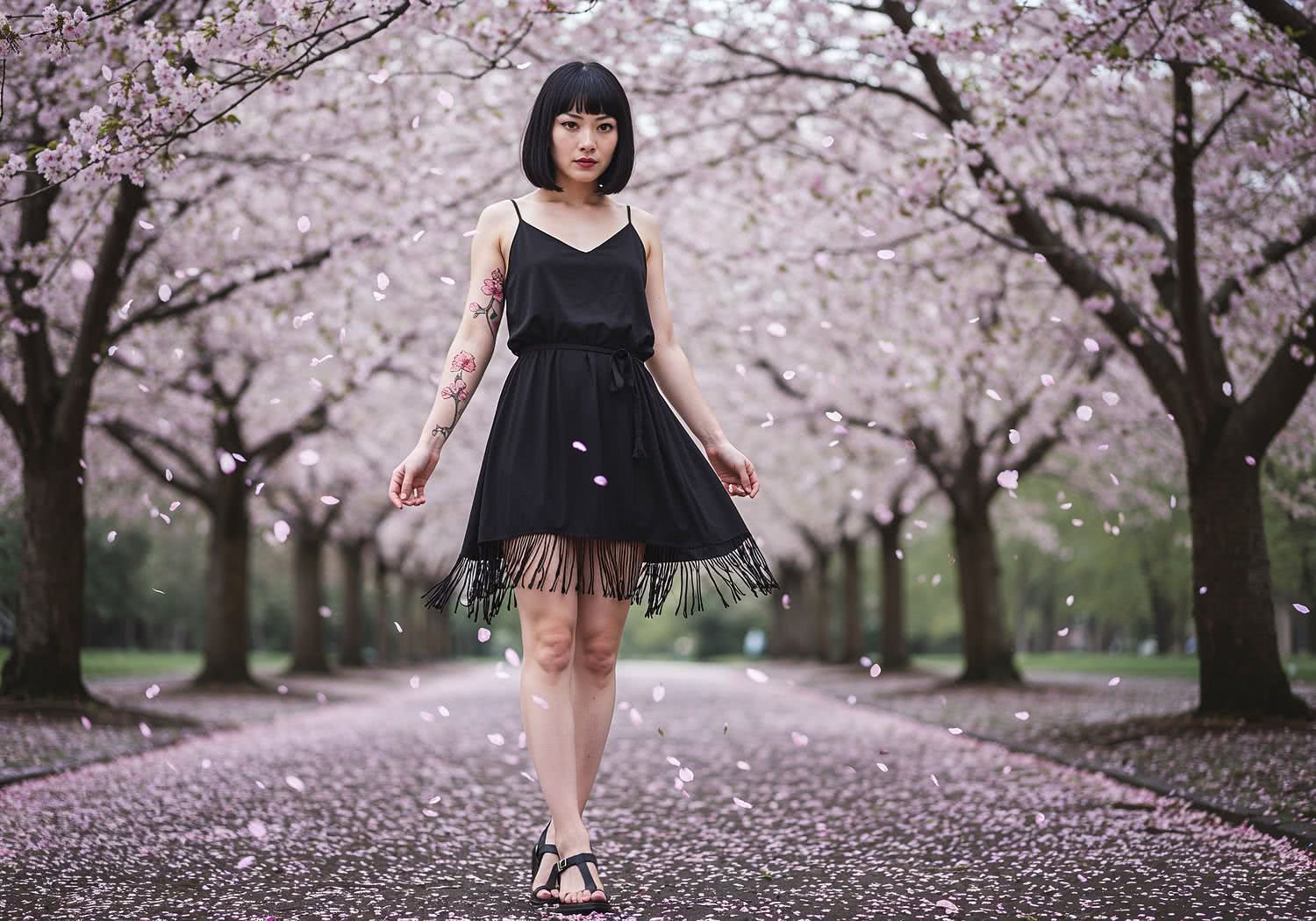Professional high-resolution fashion photography of: A professional digital illustration of a slim Japanese Asian woman with porcelain-pale skin, short black hair with straight bangs framing her face, and dark expressive eyes enhanced by bold black cat-eye eyeliner. She has a delicate cherry blossom tattoo on her left wrist. She wears a flowing black mini dress made of lightweight silk-like fabric, ending mid-thigh with subtle fringed edges that sway gently, cinched at the waist with a thin black leather belt to accentuate her slender figure. Her lips are painted in matte red lipstick for a striking contrast. On her feet are minimalist black leather sandals with thin straps wrapping around her ankles. She stands gracefully in a serene spring park under blooming cherry blossom trees, with soft pink petals drifting in the breeze, evoking a blend of traditional Japanese elegance and modern sensuality. The overall composition is elegant and atmospheric, with a focus on natural light highlighting her features and the subtle movement in the dress and petals. Overall image style is professional fashion and style photography with vivid colors, brigh soft lightning, soft vignettes, blurred background.