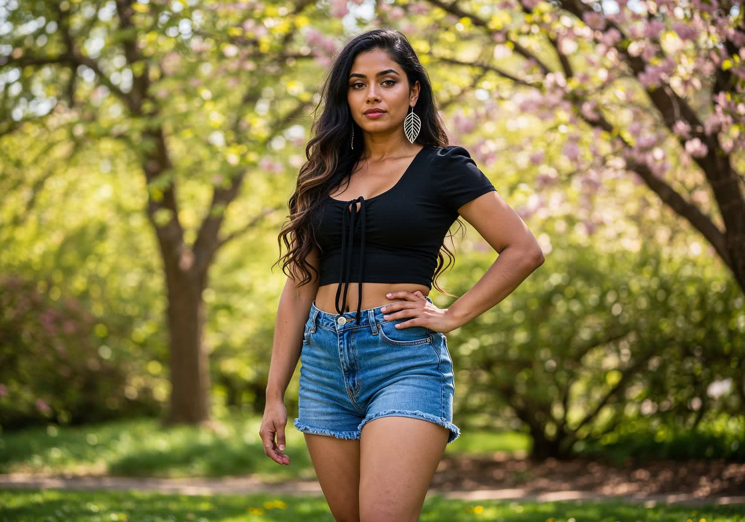 Professional high-resolution fashion photography of: A professional illustration of a confident young woman of mixed Indian and Caucasian heritage, standing gracefully in a spring urban park setting with blooming flowers and soft sunlight filtering through trees. She has warm brown skin glowing naturally, deep dark eyes enhanced with purple smoky eyeshadow and winged black eyeliner, full lips in glossy coral lipstick, and long cascading black hair with subtly lightened blonde ends shimmering with highlighter. Her slim hourglass figure features a subtle waist cinch and long, graceful legs. She wears a sleek black top with delicate ties at the décolleté, paired with high-waisted blue denim shorts with frayed edges ending mid-thigh, accentuating her legs. Simple accessories include silver leaf-shaped earrings, a thin leather belt at the waist, and white low-top sneakers. Her pose is poised and sensual, one hand on her hip, exuding everyday boldness and spring sensuality, in a vibrant yet realistic style with warm tones and dynamic lighting. Overall image style is professional fashion and style photography with vivid colors, brigh soft lightning, soft vignettes, blurred background.