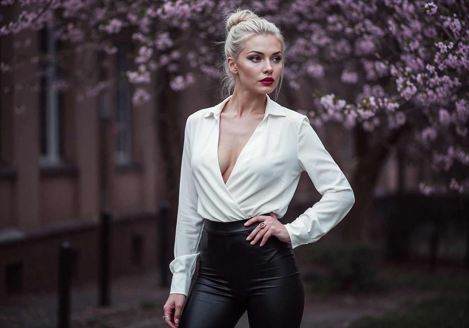 Professional high-resolution fashion photography of: A professional illustration of a confident Eastern European woman in her mid-20s, with pale skin, striking blue eyes, and long platinum blonde hair styled in a loose high bun with a few strands cascading down her neck. She has a slender, tall figure with long legs, wearing a flowing white silk blouse with a deep V-neckline that accentuates her décolletage, tucked into high-waisted black leather leggings that hug her silhouette for a sensual, elongated effect. Her makeup features sharp black cat-eye eyeliner, matte brick-red lipstick, and subtle highlighter on her cheekbones for a glowing, mysterious allure. She wears a single silver ring with an amber stone on her finger. She stands poised in a spring evening urban setting with soft twilight lighting, blooming cherry blossoms in the background, exuding bold sensuality and self-assurance. Render in a realistic yet artistic style with high contrast between white and black tones, emphasizing elegance and spring freshness. Overall image style is professional fashion and style photography with vivid colors, brigh soft lightning, soft vignettes, blurred background.