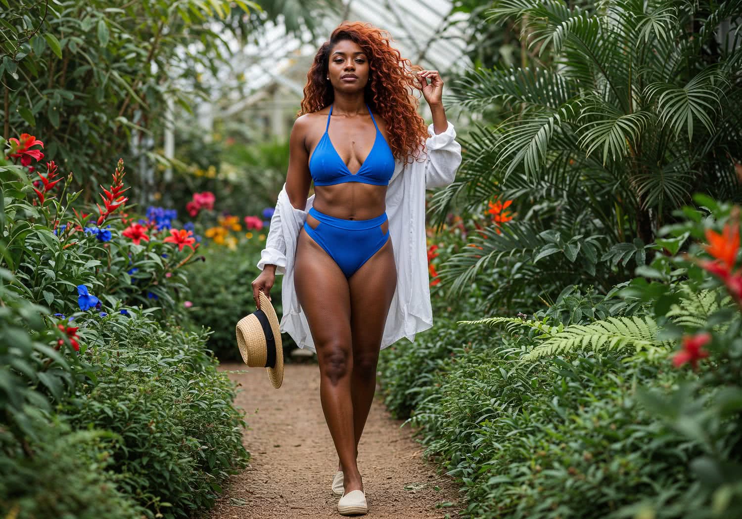 Professional high-resolution fashion photography of: A professional illustration of a confident 25-year-old woman with dark skin and long, curly red hair cascading over her shoulders, walking gracefully along a sunlit path in a lush botanical garden on a warm summer day. She wears a sensual cobalt blue halter trikini swimsuit that ties around her neck, exposes her smooth back, and features subtle blue inserts on the straps and sides with elastic bands accentuating her waist, highlighting her natural figure without tattoos or piercings. Over the swimsuit, she has a sheer, flowing white linen tunic draped loosely on her shoulders, paired with flat neutral espadrilles and a wide-brimmed straw hat. Gentle wind tousles her hair as vibrant tropical flowers, ferns, and greenery surround her, evoking elegance, sensuality, and harmony with nature in a vibrant, summery palette of blues, greens, and earthy tones. Overall image style is professional fashion and style photography with vivid colors, brigh soft lightning, soft vignettes, blurred background.