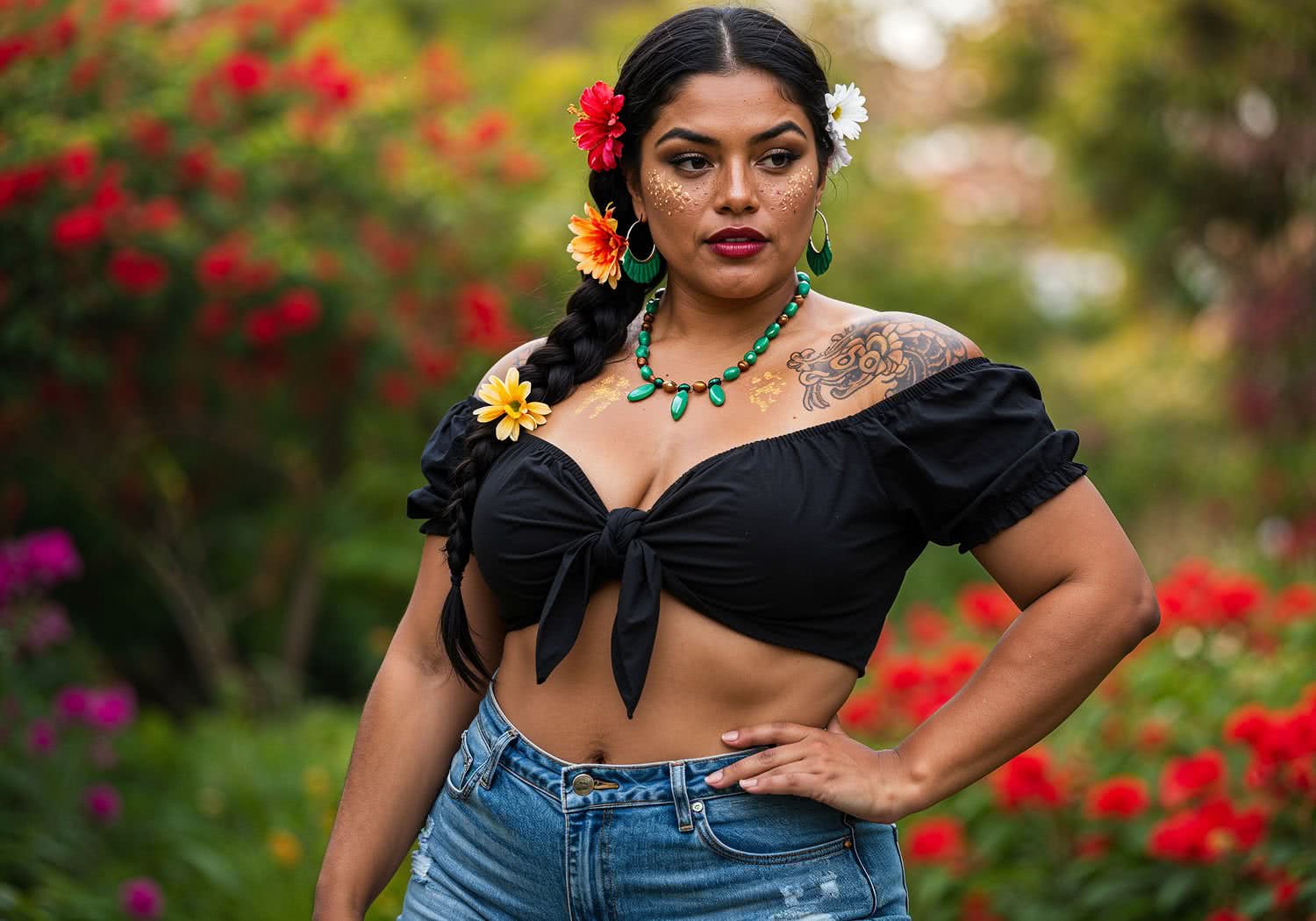 Wiosna to czas, gdy natura budzi się do życia, a moda zachęca do eksponowania naturalnego piękna. Wyobraź sobie meksykańską kobietę o oliwkowej skórze, z piegami na policzkach i brązowymi oczami, która nosi sylwetkę klepsydry – z wydatnymi biodrami i wąską talią. Jej długie czarne włosy splatają się w luźny warkocz ozdobiony kwiatami, a na ramieniu dumnie prezentuje tatuaż azteckiego symbolu. Ta latynoska bogini inspiruje do stworzenia odważnego, zmysłowego looku, który podkreśla krągłości i prowokuje spojrzenia. W tym artykule zanurzymy się w świat wiosennej stylizacji, skupiając się na czarnym crop topie z wiązaniem z przodu, jeansowych szortach z wysokim stanem, makijażu smoky eyes w ciepłych tonach oraz błyszczącej czerwonej szmince. Dodamy highlightera na ramieniu z tatuażem, kolorowy naszyjnik z jadeitu i porady, jak osiągnąć ten olśniewający efekt. To nie tylko moda – to celebracja latynoskiego dziedzictwa i kobiecej siły.